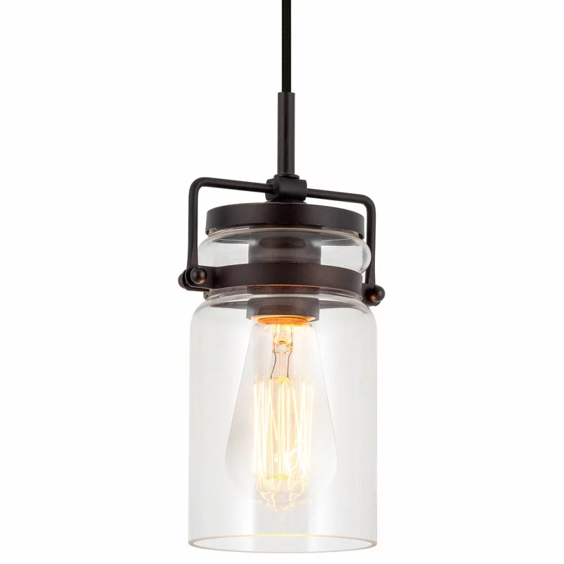 The Wyer vintage industrial / retro style pendant light with clear jar glass shade and oil rubbed bronze finish works well in settings like kitchens, dining rooms, cafes, restaurants, bars, or clubs, and with almost all design styles / interiors. The gold trims on the pendant lights are hand-painted: therefore, each pendant light has its subtle uniqueness. You will not be disappointed when you see this fixture in person! This pendant light can accommodate 60W equivalent LED, incandescent, or CFL bulbs. UL approved for your safety, unlike some low-price competing products.