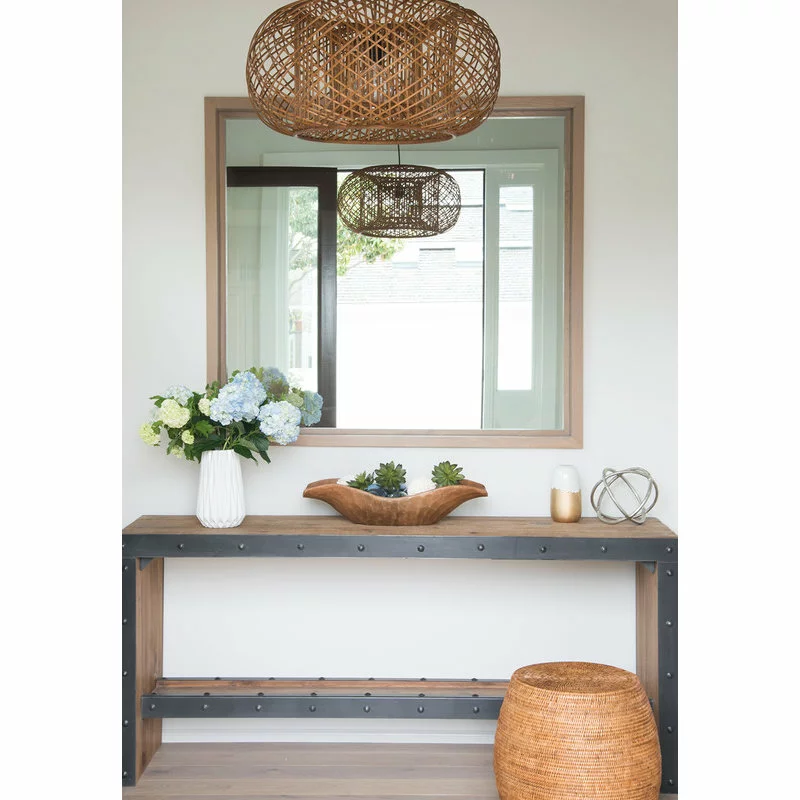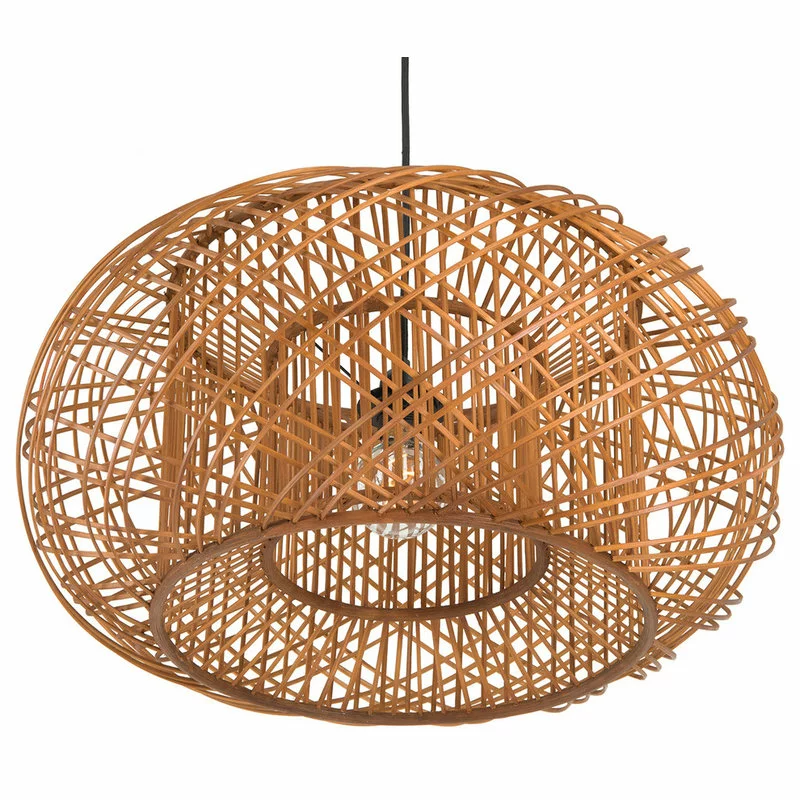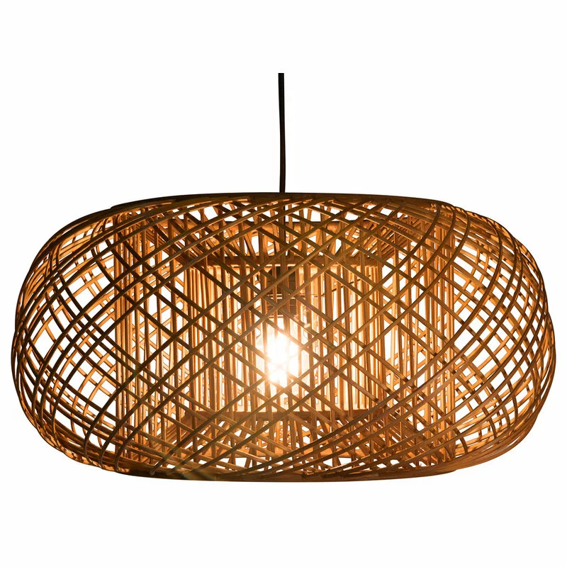 Let the light shine through with this bamboo crisscross pendant lamp. The contemporary design is sure to be a showstopper and will be beautiful hanging over a kitchen or dining room table. Explore using this rustic brown bamboo hanging lamp in a powder room, foyer or over the kitchen island.