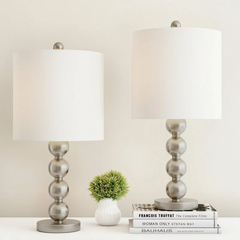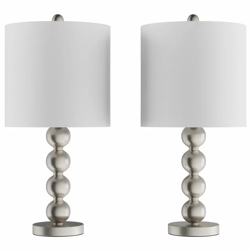 Bring modern flair to any room in your home with the Set of 2 Contemporary Stacked Ball Table Lamps by Lavish Home. With a beautiful sturdy stacked orb metal base in brushed silver finish and ivory poly-cotton shade, the lamps provide warm ambient lighting for your entryway, bedroom, living room or home office. The UL-listed lamps conveniently come with energy-saving, replaceable LED lightbulbs. Its a perfect matching 2-piece set that will add a stylish touch to the nightstands or end tables in any room.