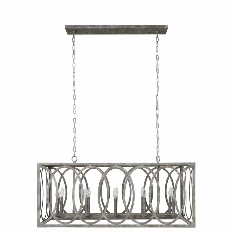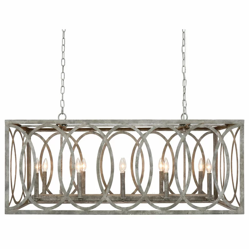 This large and tall rectangular is the new trend of simple clean lines, updated with rings to add sophistication. Perfect in modern farmhouse or transitional chic interiors. The distressed gray finish is hand-applied with many layers of colors to give depth and richness. Note: this large fixture is more suitable for a large room with higher ceiling. Also available in 12″, 18″, 24″, 31″ and 48″ drum pendants, in gold, gray or brown finishes.
