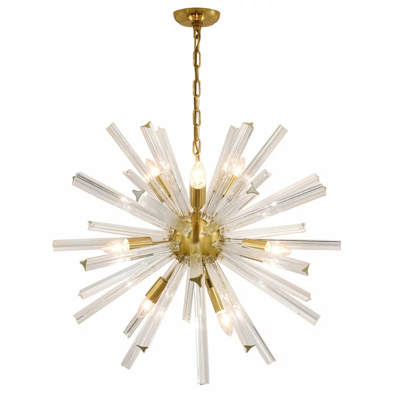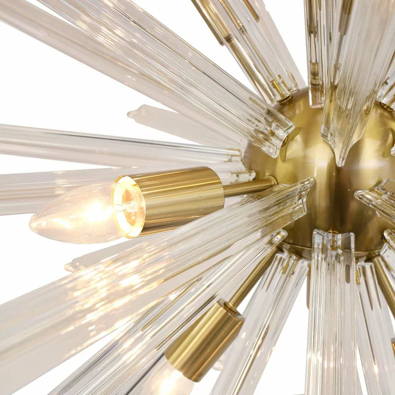 The classic combination of triangular, fluted clear glass rods with satin brass sphere makes a transitional-modern statement over a dining table, study or bedroom. Installation by a licensed electrician is recommended.