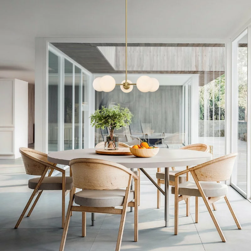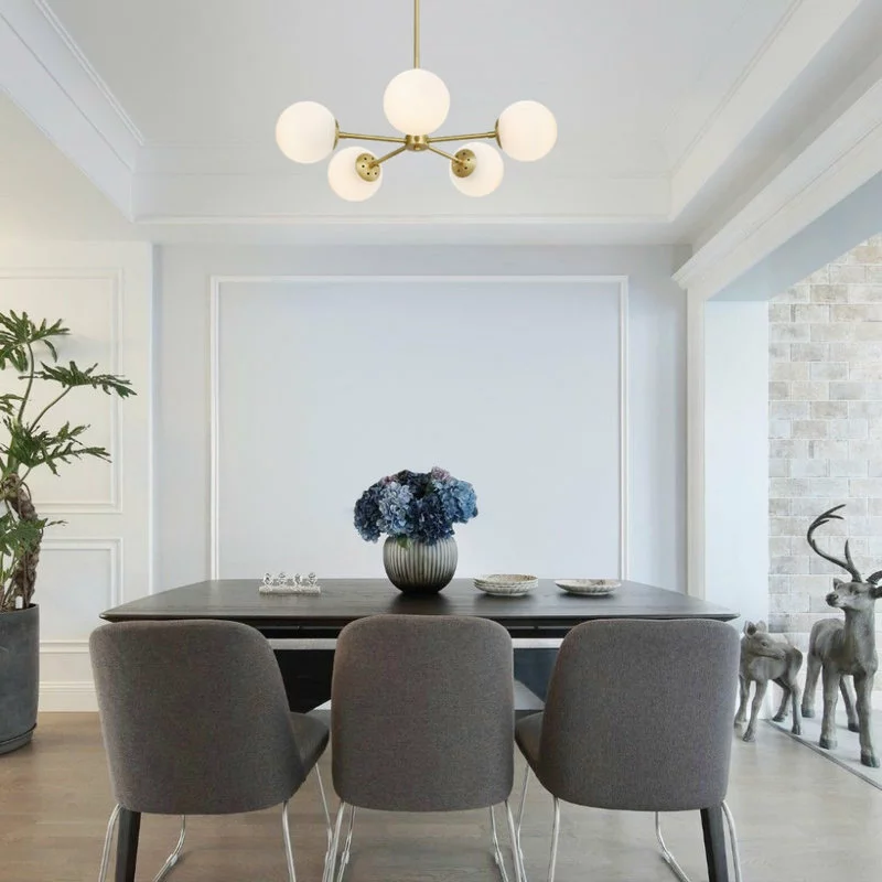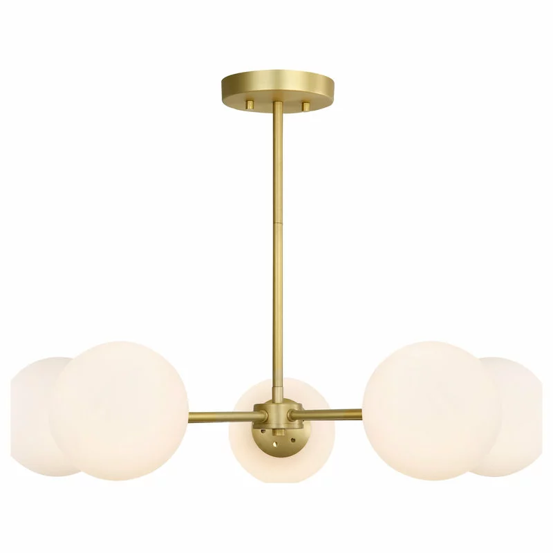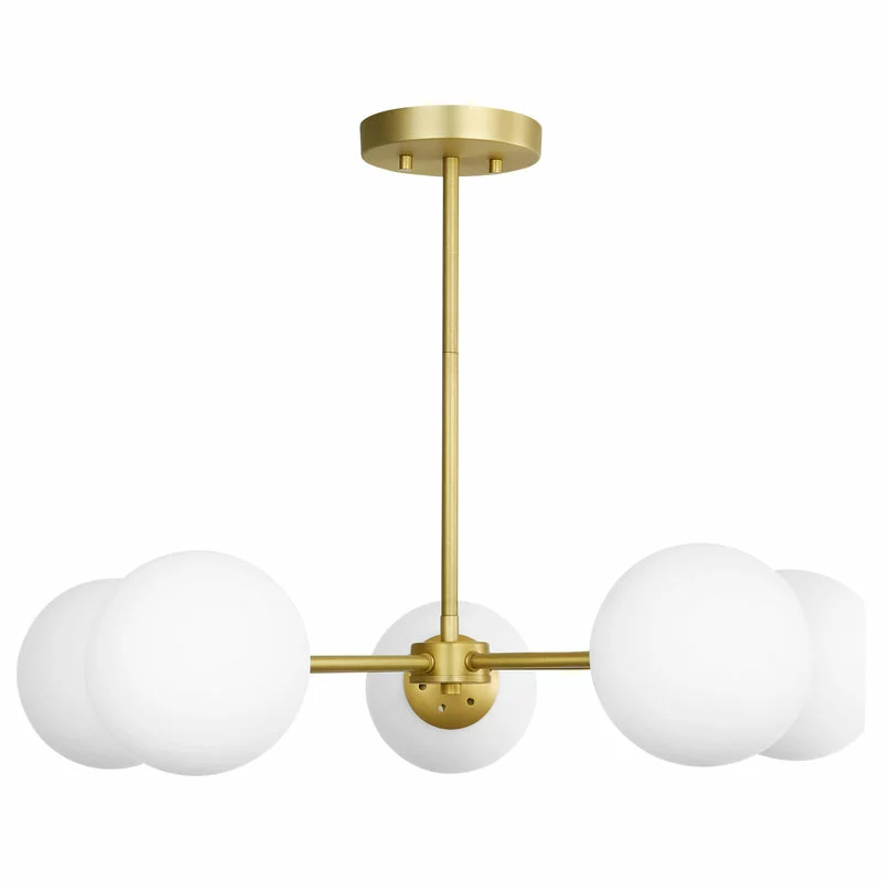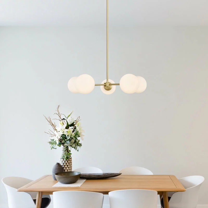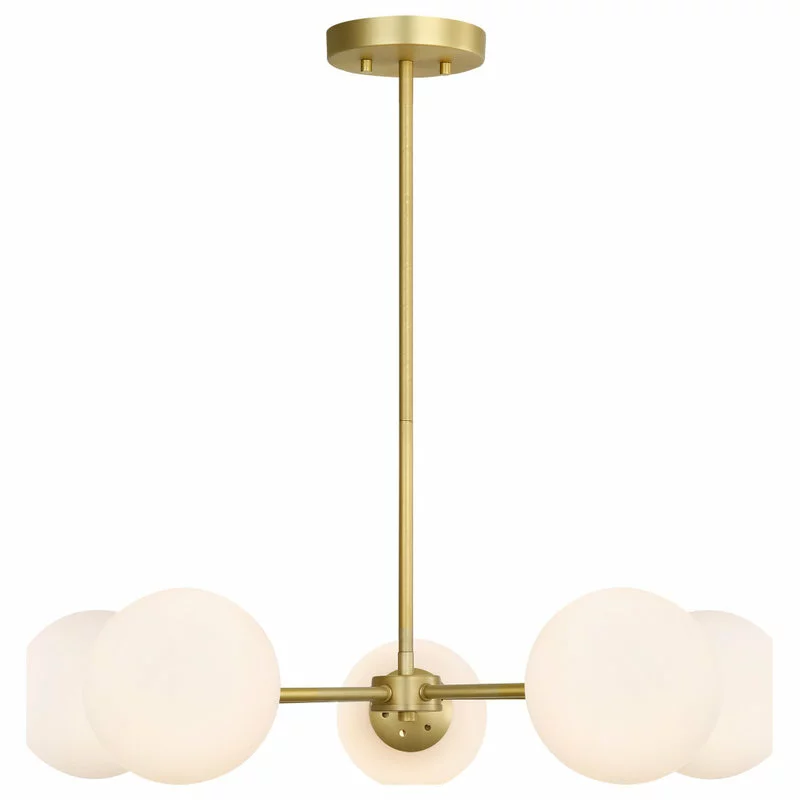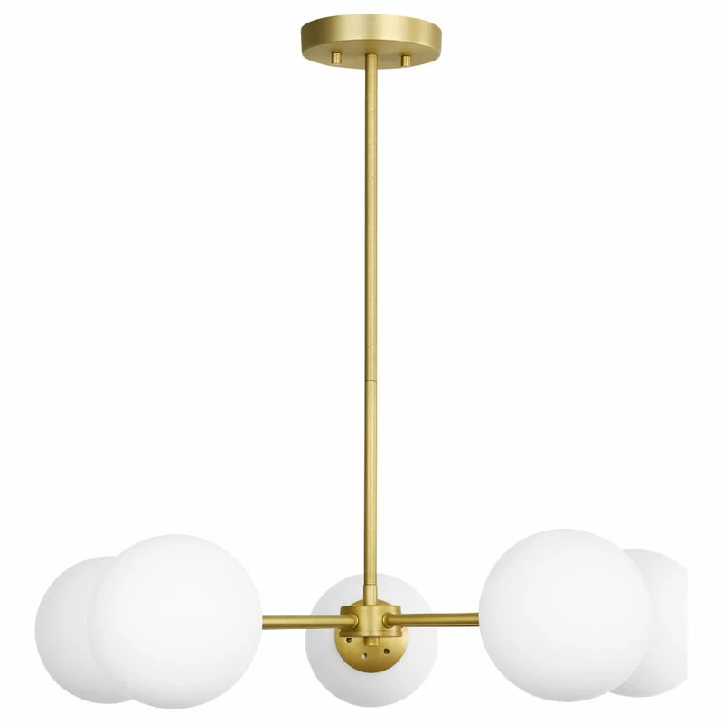 Add to the splashy ambiance of a mid-century styled space with the Milan Five-Light Chandelier. An atomic arrangement of global orb shades attracts eyes in an upward direction and adds a sleek framing quality for a dining or living space. Choose a glass type that perfectly complements a design scheme, and enjoy the warm brass finish of its iron frame. Three rod lengths are included to offer differing suspension heights. Its LED-compatible technology and full dimmability features are welcome additions.