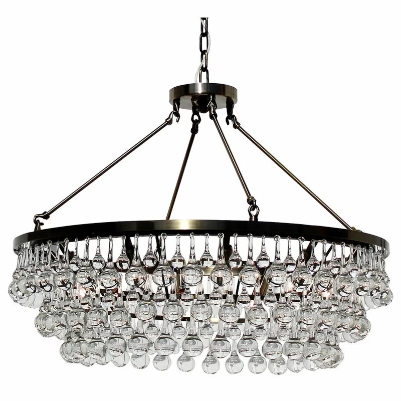 Hundreds of large clear glass drop crystals surround this antique brass finished frame. With the ability to display this light as a hanging or flush mount version, the versatility of the Celeste Chandelier makes it the perfect fit for any space.