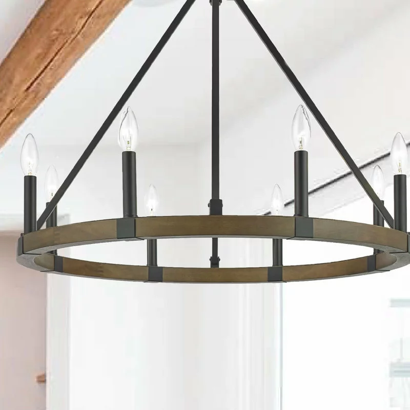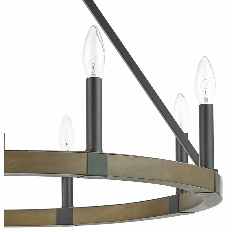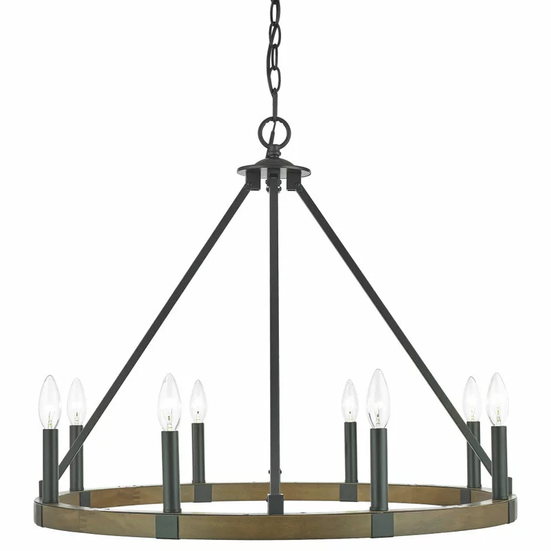 Contemporary inspired shape with a traditional wooden rustic wagon-wheel design, this 8 Light chandelier uses this time-tested shape and mixes the farmhouse finishes of wood and matte black for a finished look. This chandelier uses 8 candelabra based bulbs with a max wattage of 60 watts, and is LED compatible (bulbs not included).