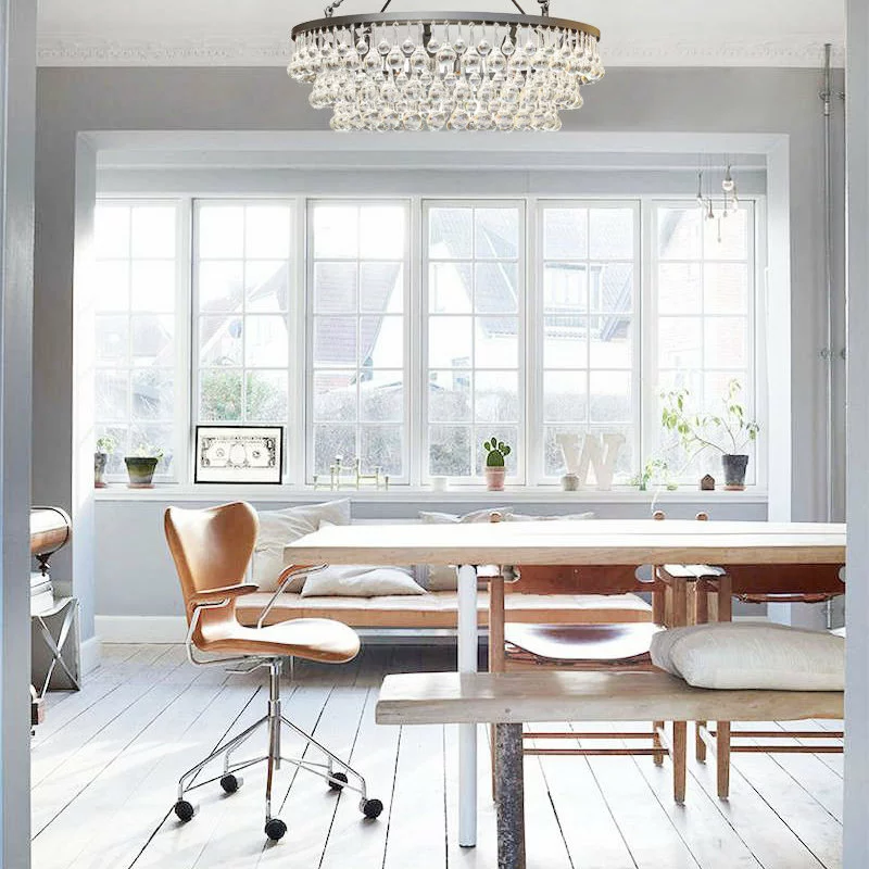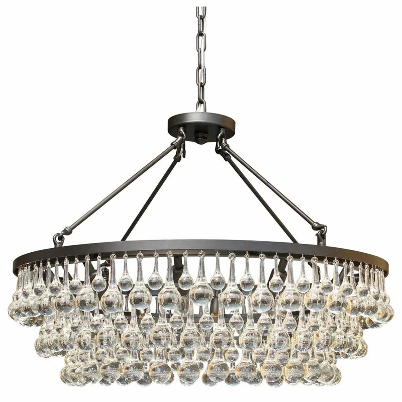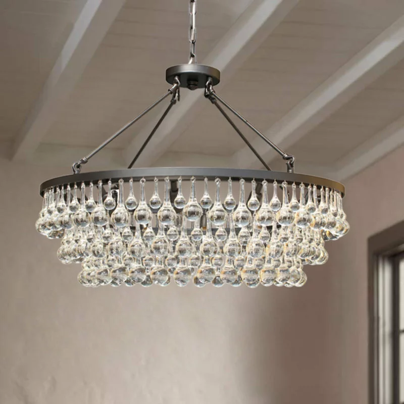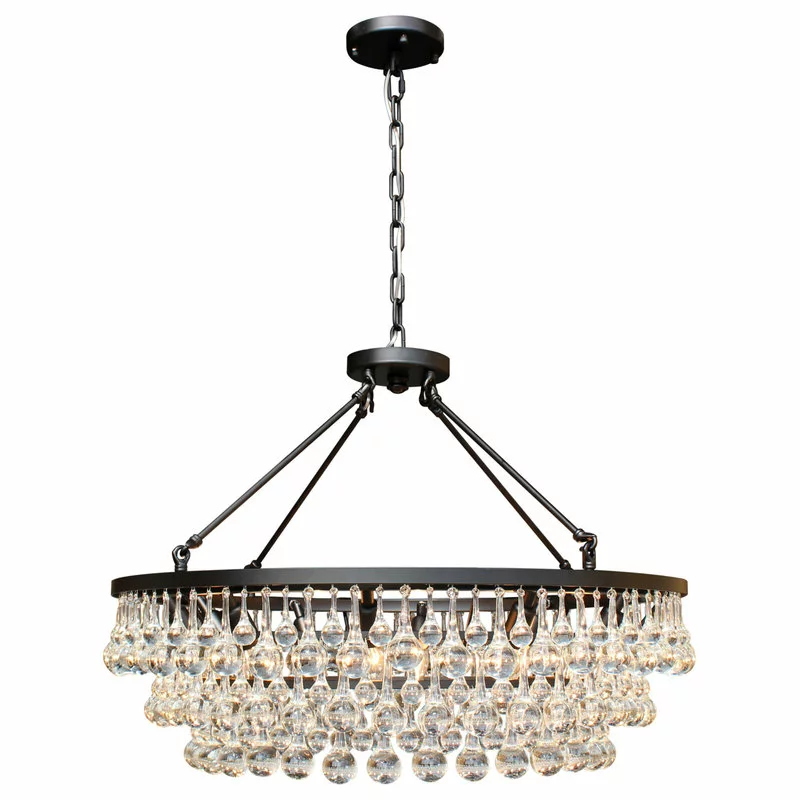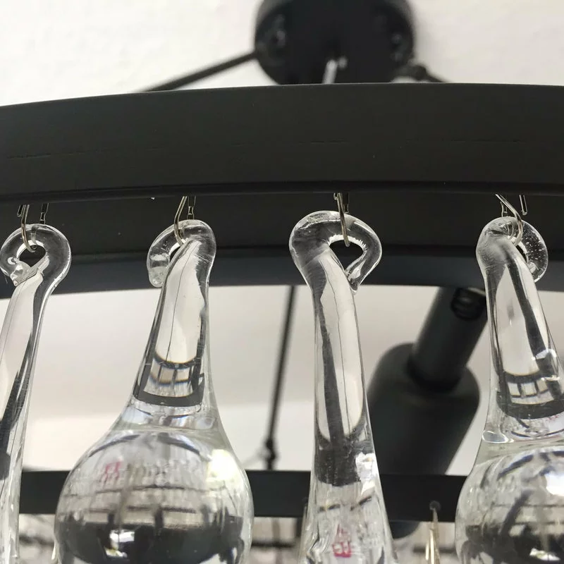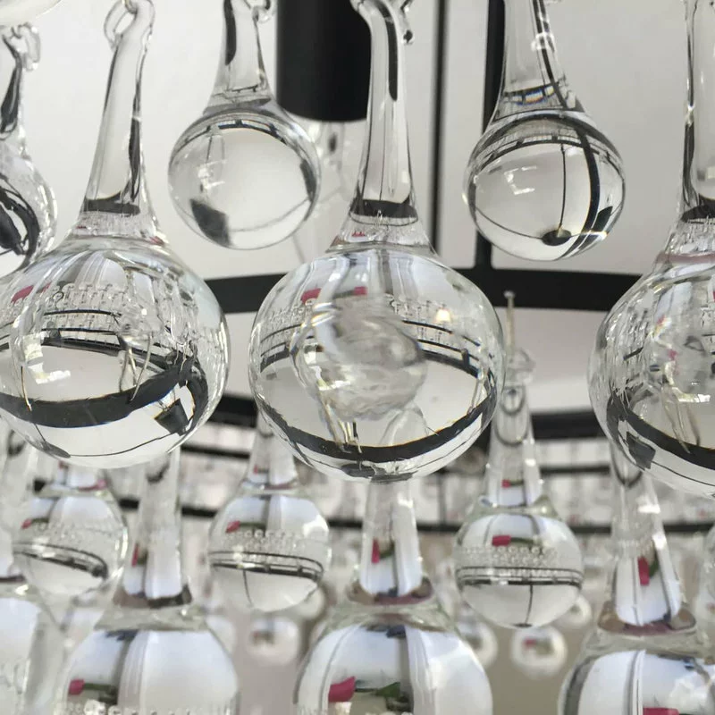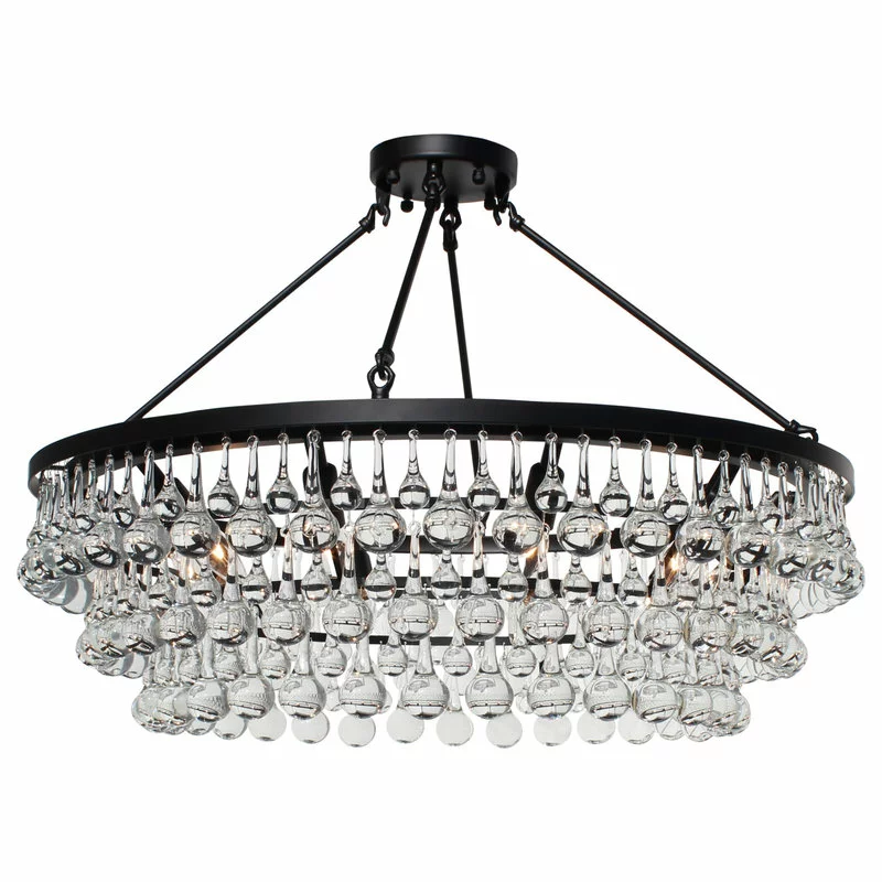 Hundreds of large clear glass drop crystals surround this black finished frame. With the ability to display this light as a hanging or flush mount version, the versatility of the Celeste Chandelier makes it the perfect fit for any space.