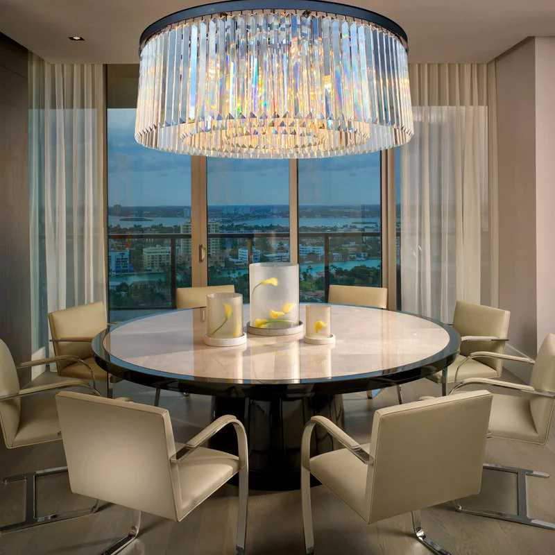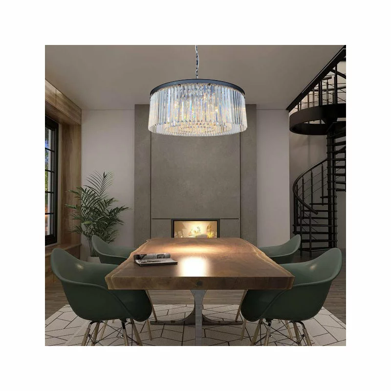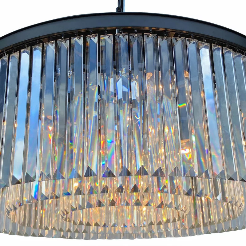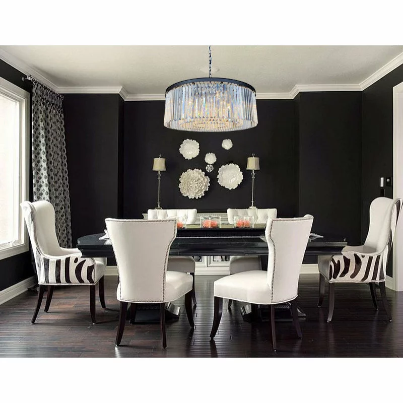 This stunning piece mixes vintage industrial style with a modern flair. The D’Angelo Chandelier features clear glass prisms on a large round black finished frame. This stunning chandelier will create a showpiece for your home.