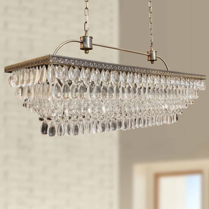 This beautifully unique rectangular chandelier captures your attention and lights up your home! This gorgeous chandelier is accompanied by 10 feet of matching double chain and finished off in glistening crystals that sparkle from every angle.