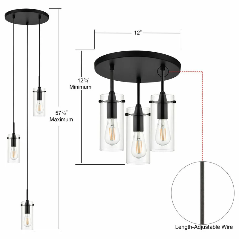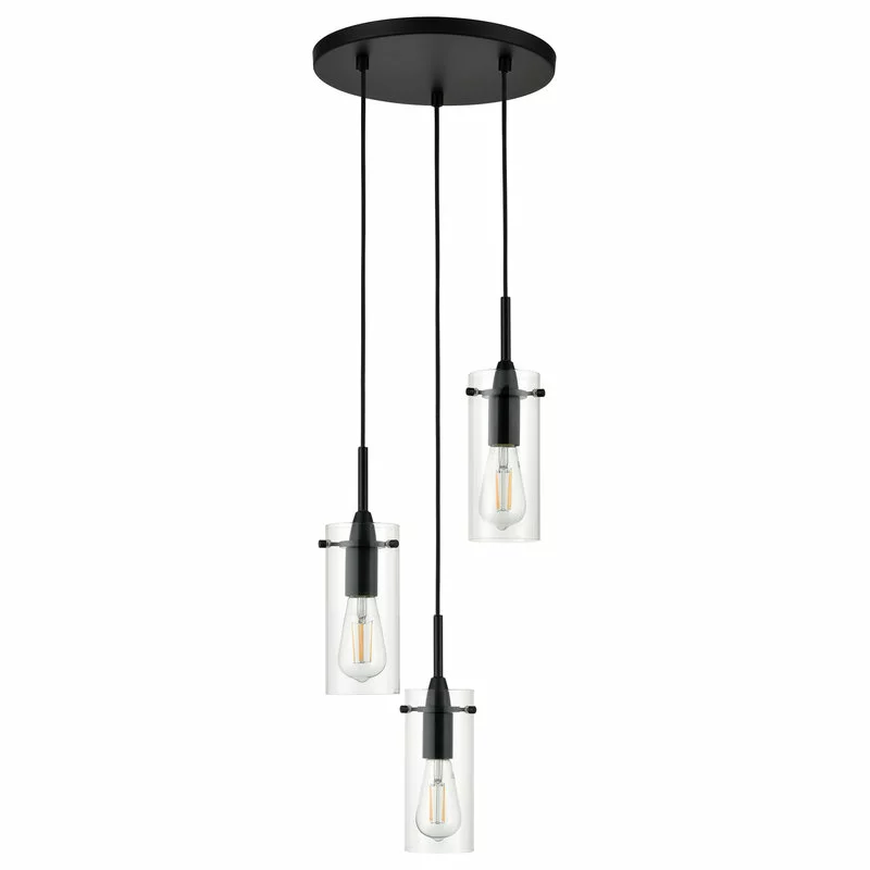 The Effimero 3 light cluster pendant light fixture features a modern design that adds an industrial look to any setting. This multi light chandelier offers a black finish, exposed hardware and clear glass shades. Adjustable fabric cords allow for customization of the length of the lights.