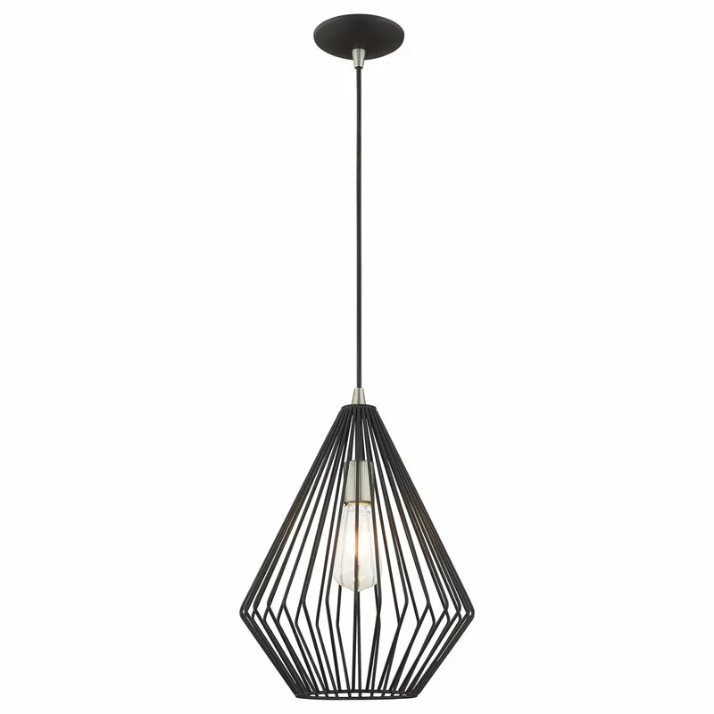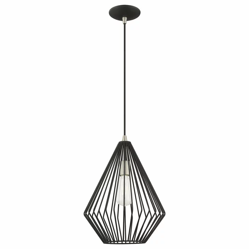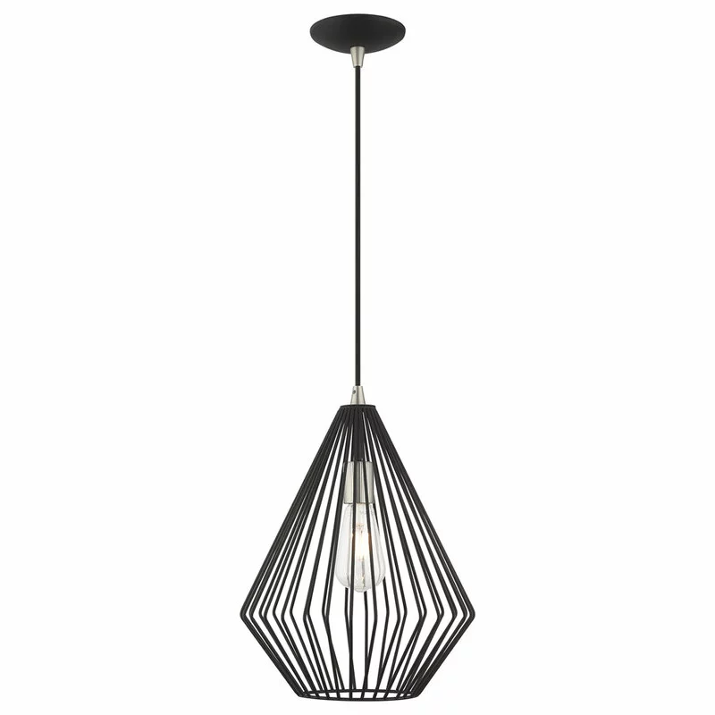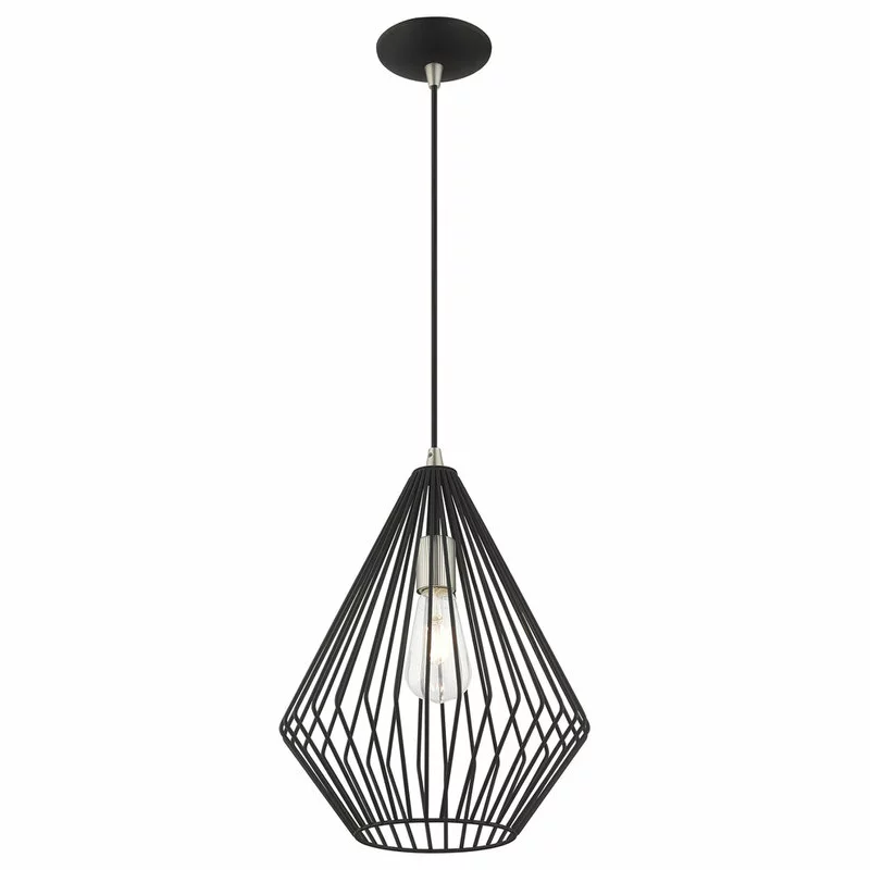 The stunning dimension make this contemporary mini pendant a modern home lighting choice. The open, black geometrical shade design allows an easy flow of light to shine over a dining room table or kitchen island.