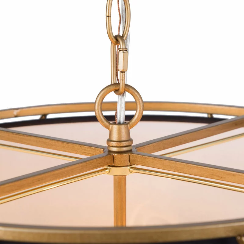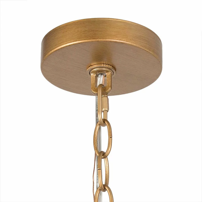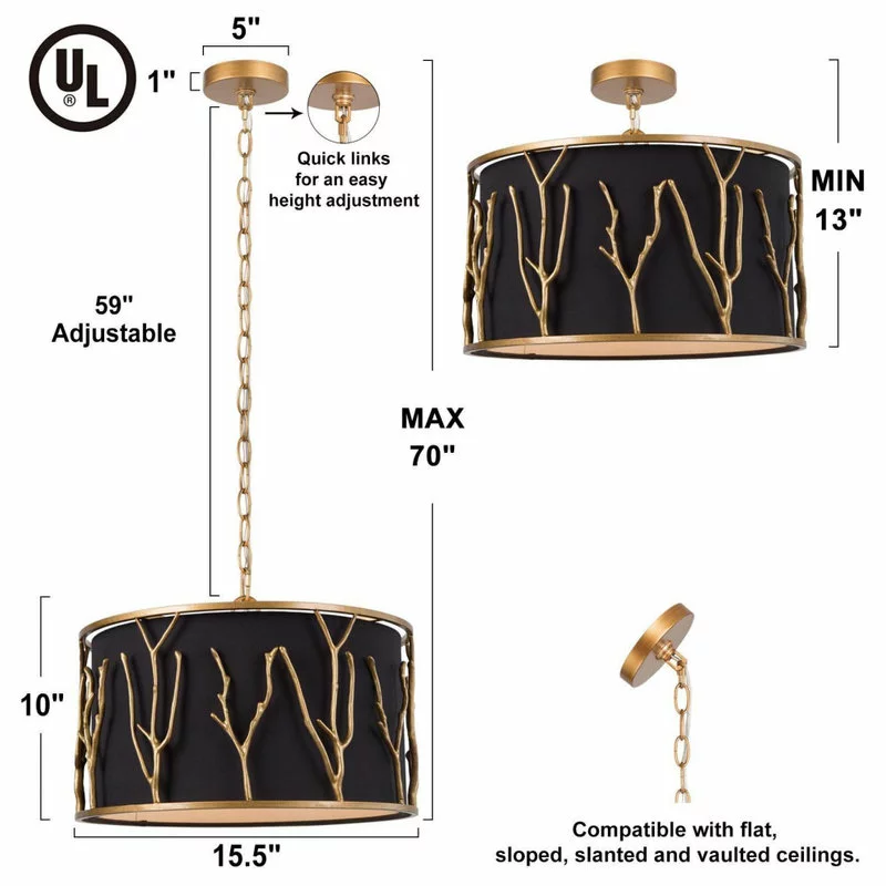 This sleek modern chandelier surrounds a 4 light cluster with a thin metal drum shade. The Matte Black shade covers by geometric design in gold has a wonderful vintage look with some modern charm. Embellished you room with this effortless fixture that you shimmer your space.