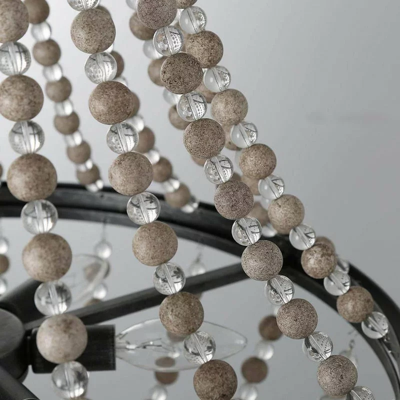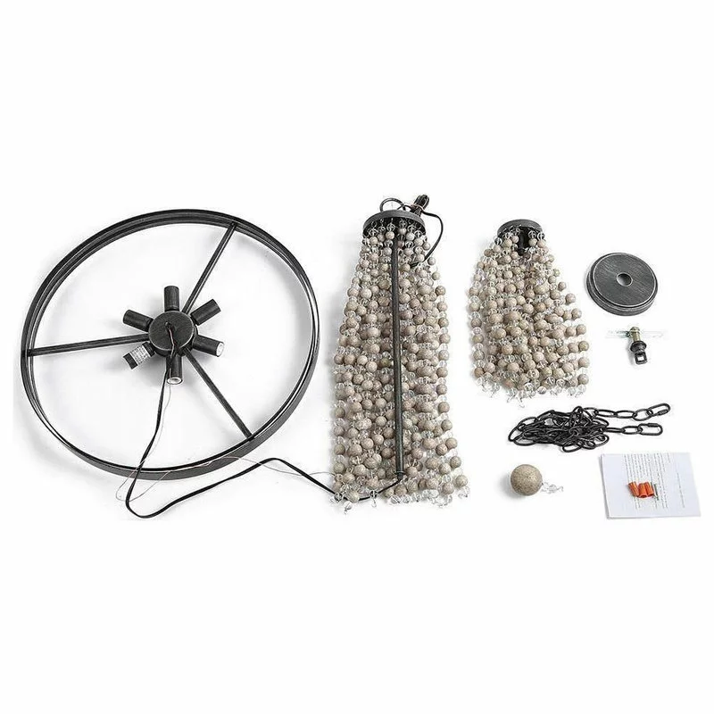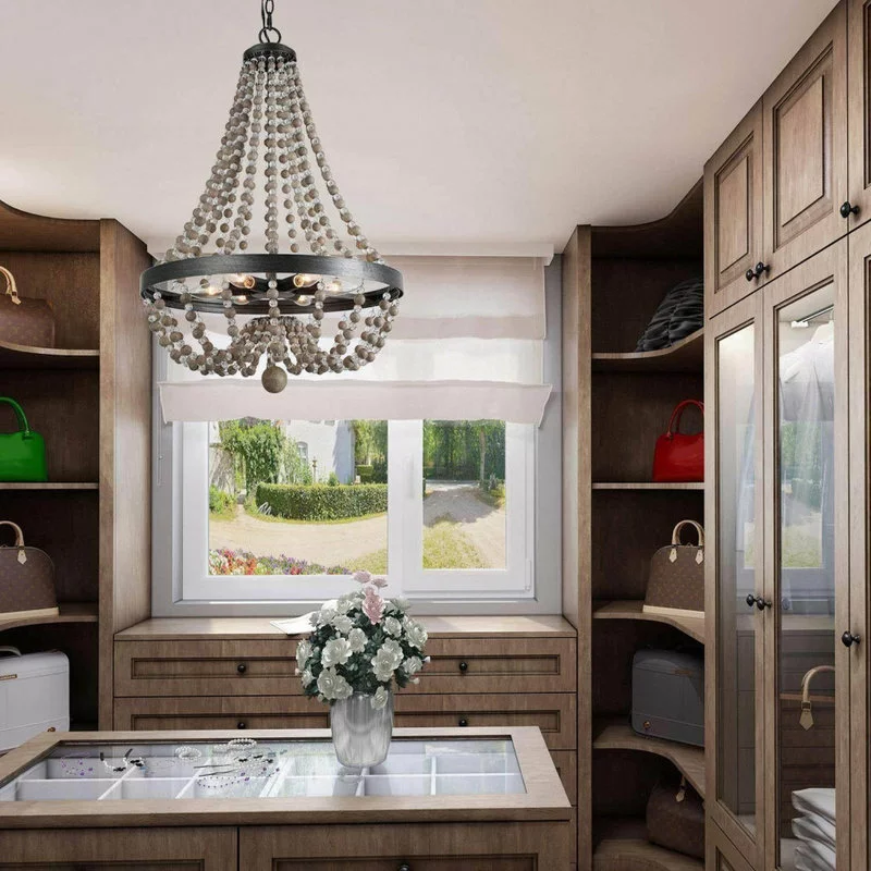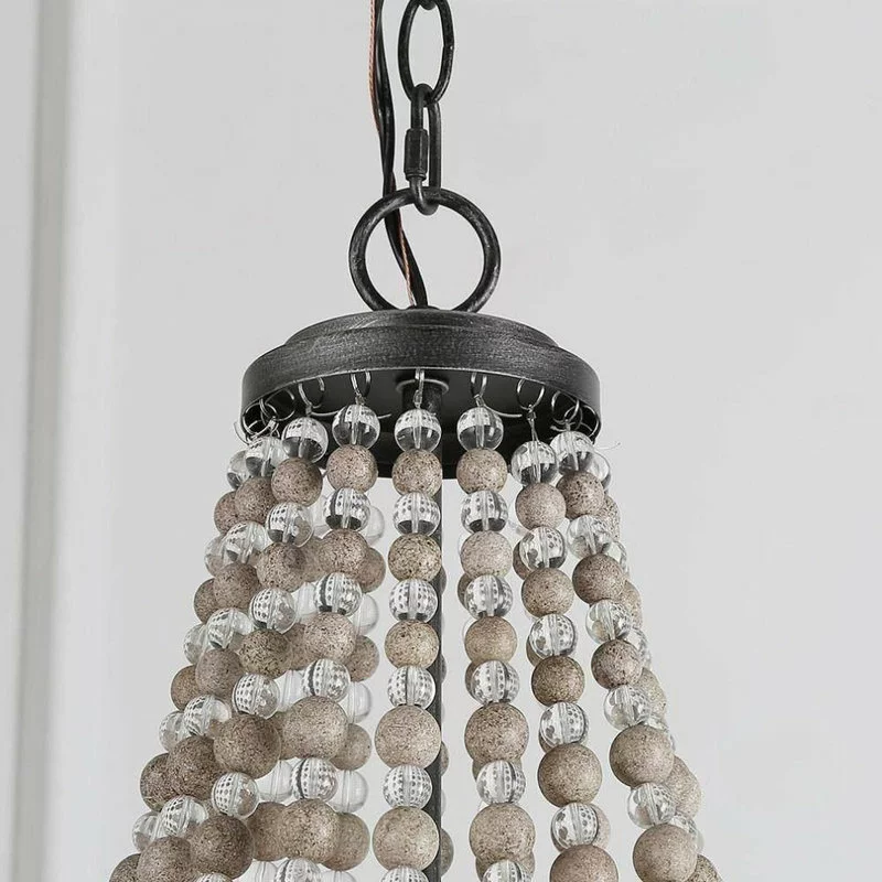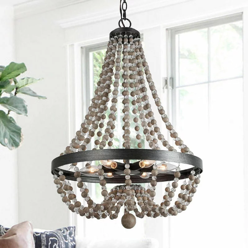 This wood and crystal beaded farmhouse chandelier features distressed wood beads and clear crystal beads. Bead color gradients for added visual interest bring high-end and elegant glamour to the room, with a rustic update with a black finish and a basket shape for a classic look. It also features other sizes of chandeliers and recessed lights from the same range, perfect for your living room as well as your personal space.