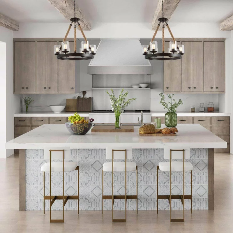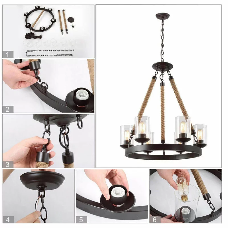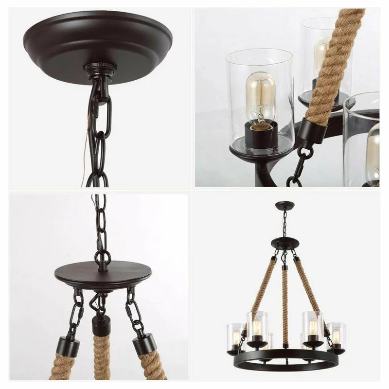 This 6-Light farmhouse wagon wheel chandelier to complete display rustic and eclectic style of your home with this rope collection. It features a bronze framed fixture with rope wrapped arms. The fixture is painted in a dark bronze finish, and complimented with a clear cylinder glass. Clean spherical iron frame gives this collection the status of an instant classic. Using with Edison filament bulbs to convey the retro visual.