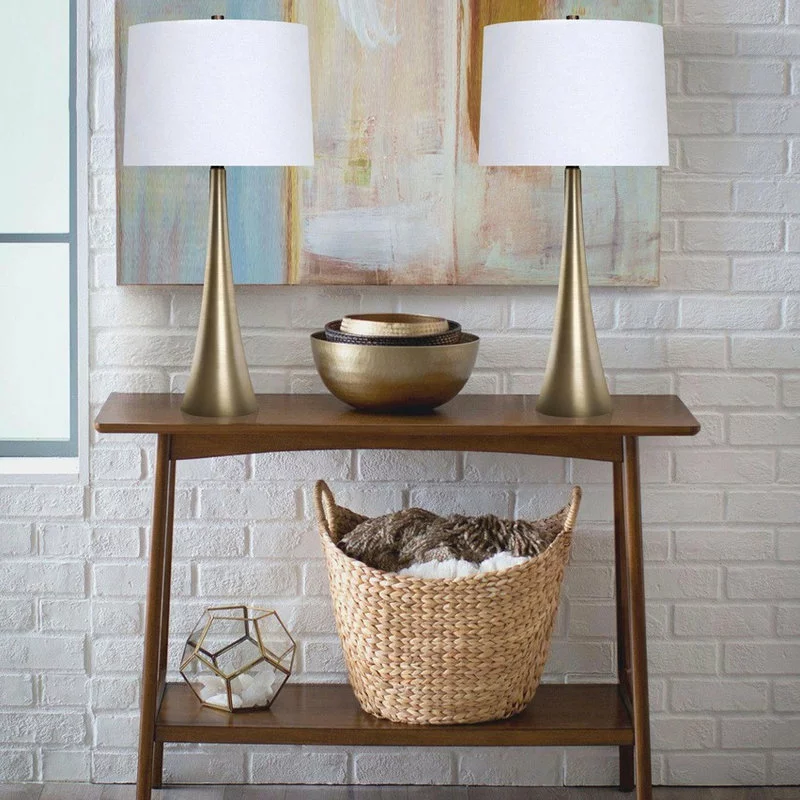 This slim and sleek set of metal table lamps perfectly balances modern flair and minimalism with its clean lines and plated gold finish. Each lamp’s round base tapers in a graceful elongated curve up into its beautiful off-white linen shade. Whether resting on your nightstands, set on side tables in the den, or tucked into your favorite reading nook, this set of lamps can add a touch of modern flair to any space. Set of two lamps, each is 29.5″ tall. Round bases are 6″ wide. Tapered shades are 14″ at their widest and are 10″ high. Each lamp uses one 100-watt maximum “A” bulb (not included) and features an E26 socket with a 3-way switch. Get custom colored lighting and effects by using appropriate 100-watt maximum smart bulbs (not included), or plug your lamps into smart outlets (not included) that can be used with virtual assistants such as Amazon’s Alexa or the Google Home Assistant for ultimate control.