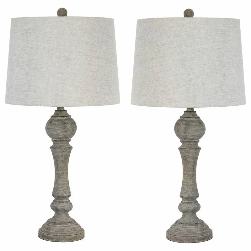 SET OF TWO – This set of two reclaimed table lamps with linen lamp shades are the perfect addition to any space to provide additional light or just as a beautiful décor element!LINEN AND A RECLAIMED GREY FINISH – These table lamps feature a versatile linen lampshade with a curvaceous spindle lamp body, finished in a reclaimed grey. They add the perfect finishing touch to any space! FARMHOUSE CHIC – The classic and contemporary design elements and grey lamp shade color ensure these lamps perfectly complement any style, type or color décor. FOR BEDSIDE AND MORE – This pair of grey lamps is perfect for setting on bedside tables, dressers, front entry tables, dining buffets, couch side tables or any space that you’re looking to add some wow to! HIGH-QUALITY AND DURABLE – These table lamps are the highest quality, durable and sure to last the test of time. You’ll be enjoying additional light and a beautiful décor touch for years to come!