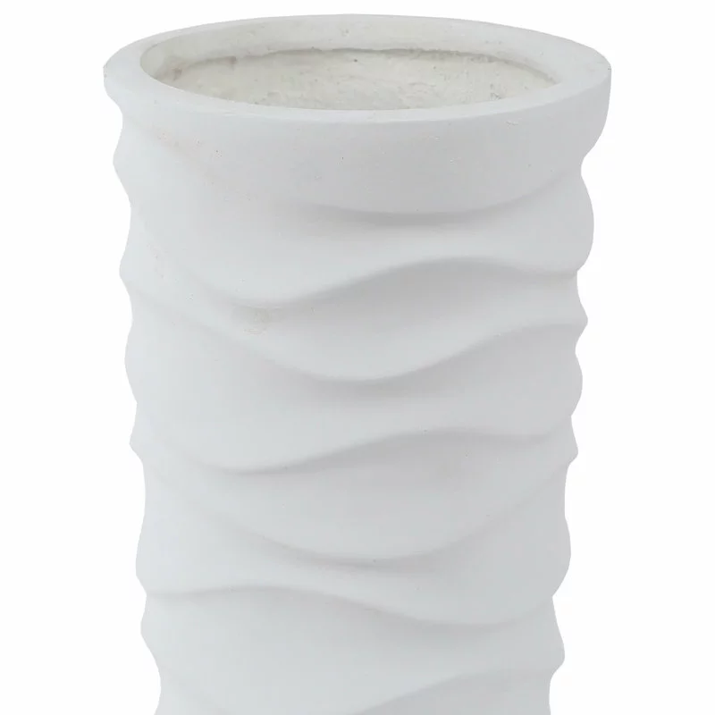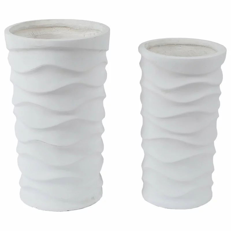 This wavy design, white finish, round planter set is made of durable MgO fiberclay, and is suitable for year round use outdoors in your garden, patio, or porch. With its beautiful white finish, the planters will make a warm ambiance to your indoors as well. The large planter is 20.1in. H, and is ideal for your larger foliage and plants. The smaller planter is 18.1in. H, and is ideal for your smaller to medium foliage and plants. With its modern flair, it is sure to add the finishing touch to your decor. The planters include a drainage hole.