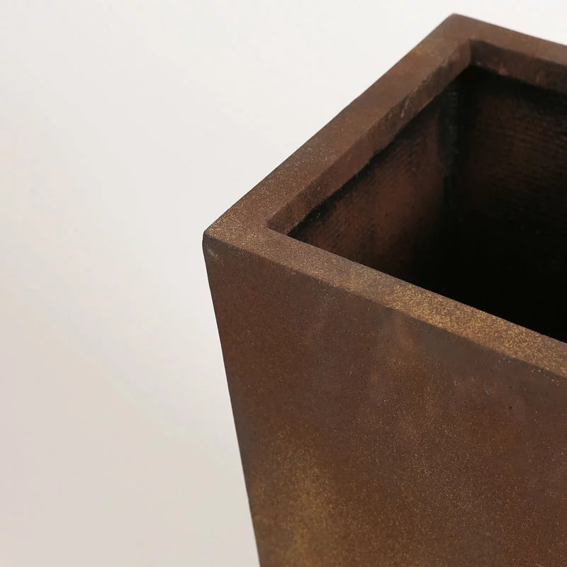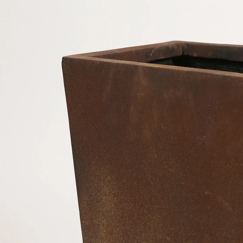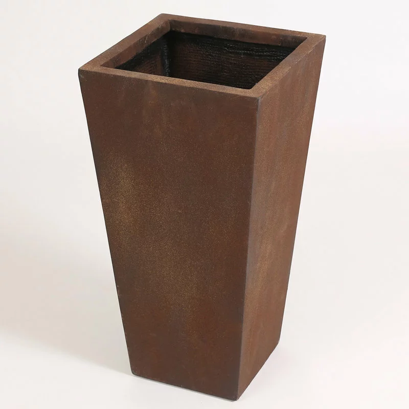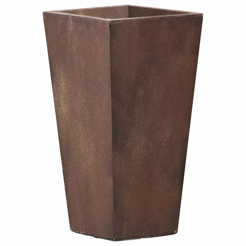 This tall and distinctive planter is the perfect addition to any front entrance. This design showcases a modern, sleek square tapered design, finished in a rustic brown perfect for the modern home. Designed to live outdoors, it is crafted from weather-resistant magnesium oxide that does not mind UV light beaming down or rainstorms rolling through, and this planter is durable and designed for all seasons. The planter includes a drainage hole so you can avoid over watering your plant. It also includes a drainage plug, so you can place it indoors to freshen up your home as well! Whether on your porch, in your sun room or entryway, this planter is the perfect complement to your style!