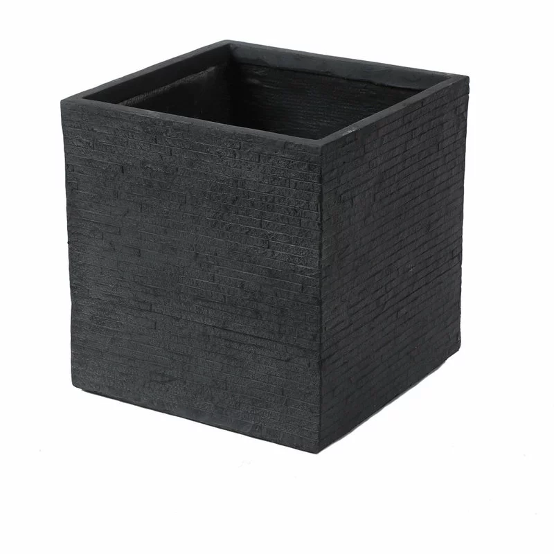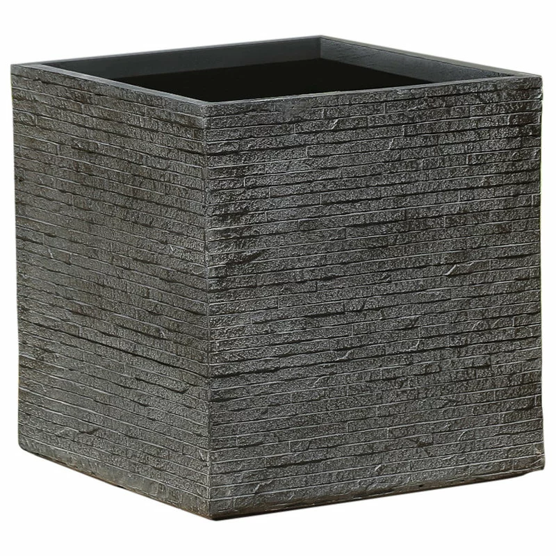This textured, stone finish, square planter is made of durable fiberclay, and is suitable for year round use outdoors in your garden, patio, or porch. With its modern-style horizontal etched lines, and textured body, the planter will make a warm ambiance to your indoors as well. The planter is 15.7in. H, and is ideal for your medium to large foliage and plants. The planter includes a drainage hole.