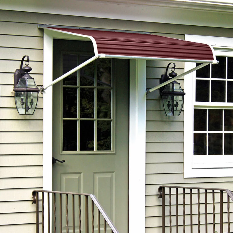 This rugged 1100 Series burgundy aluminum door canopy with support arms is designed to stand up to harsh rain, snow and sun. It reduces summer cooling cost as much as 20% while keeping you safe from the elements. Our aluminum door canopy will keep your furnishings from fading due to the daily exposure to sunlight. Canopy undersides are powder coated white. Manufactured and assembled in the USA.