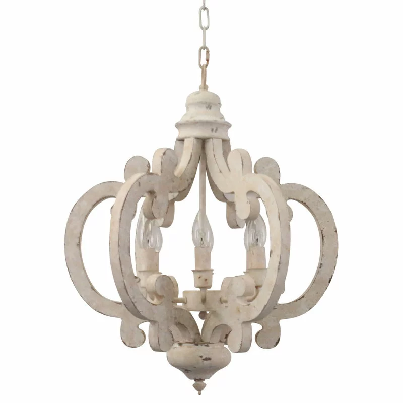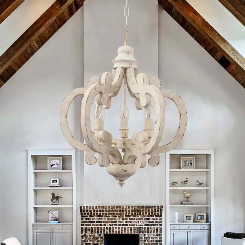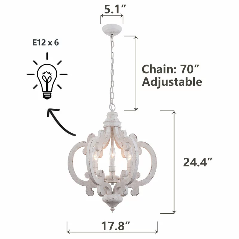 Bring the cottage chic style and refreshing feel to your home decoration with this 6-Light crown wood chandelier. With the usual crown frame, candelabra base and old wooden distressed white finish, this wooden chandelier gives you a thick sense of history.