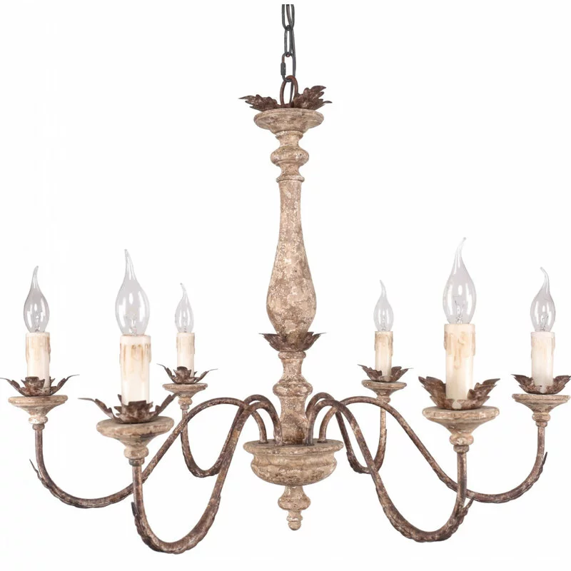 Update your decoration style and illuminate your space with this traditional elegant chandelier. The design ideal comes from the elements of the ancient European court. Through the vintage styling and shabby finish, this chandelier successfully transforms your home into a luxurious palace. It is durable and fashionable with the perfect combination of wood and iron, while is in line with the prevailing trend. The bases are designed to resemble candles which add more retro elements into the overall traditional style. The chandelier can be installed with 6 light bulbs to provide beautiful appearance and satisfy the requirement of illumination. You will never disappoint to this chandelier.