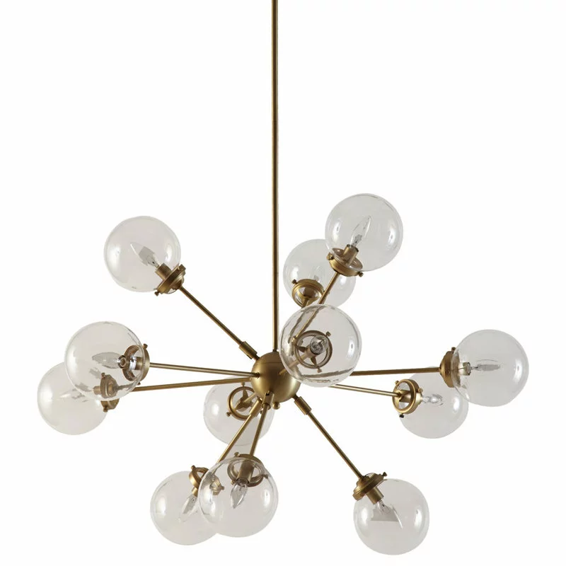 With its contemporary design, our Paige 12-Light Chandelier with Oversized Globe Bulbs adds intrigue to any space. This metal and glass chandelier features a one-of-a-kind look, with twelve clear glass shades and an adjustable base. An antique brass finish provides a sleek modern touch to any living and dining rooms. We suggest professional installation. Twelve Type-B light bulbs are needed. Bulbs are not included.