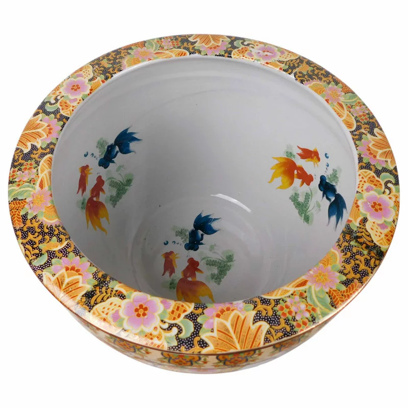 Available in six sizes, this 10″ porcelain fish bowl planter from China has a traditional Japanese Satsuma style pattern. Two panels are painted with geisha’s in kimonos while butterflies and flowers are on the other two panels. Rich metallic gold is glazed in floral accents so thick that it’s textured. The color pallet is wide and the contrasting tones make a great visual. We provide hard to find large floor sizes or use smaller sizes for table top decor. Add an elegant design statement to your planter with one of our vase stands available in a wide assortment of styles and wood types. Remember to use the bottom diameter size when selecting your stand.
