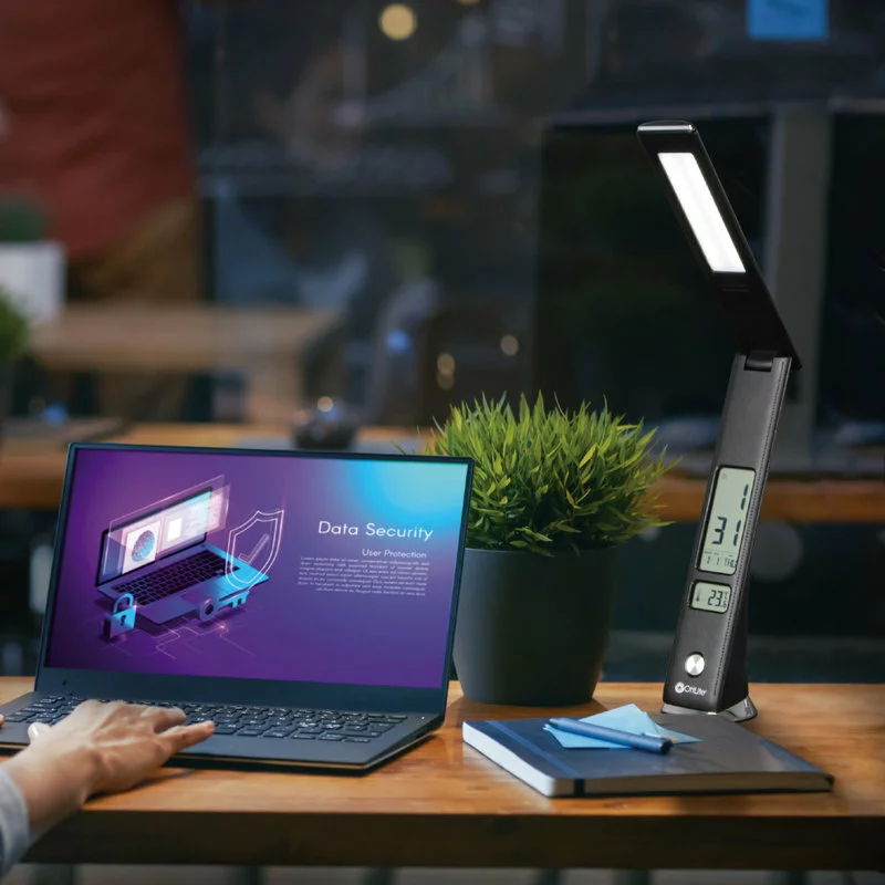 Focus on your writing or computer tasks with this OttLite Rise LED Desk Lamp with Digital Display. ClearSun LED technology optimizes illumination while helping reduce eyestrain by 51%, and the built-in digital display shows time, date, alarm and temperature information to help you structure your day. This OttLite Rise LED desk lamp has three color temperature modes with three brightness settings for flexible ambience. And the 5V, 2.1A USB port conveniently and quickly charges mobile phones and tablets.