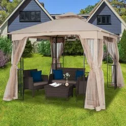 International Caravan 10′ Aluminum/Polyester Double-Vented, Drapes Square Gazebo, Dark Gray/Ruby Red