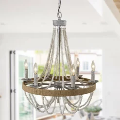 LNC Lighting LNC 6-Light Farmhouse Wagon Wheel Wood And Glass Shade Chandelier, A02992