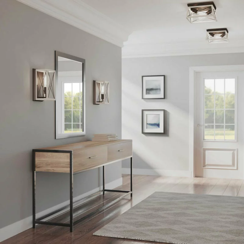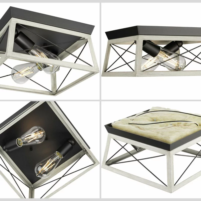 The Briarwood collection features a classic pattern commonly found on barn or farmhouse doors and gates. The simple geometric form features a faux-painted wood enclosure to frame vintage-style light bulbs. A coastal-inspired whitewashed finish paired with Graphite details. Two-Light flush mount.