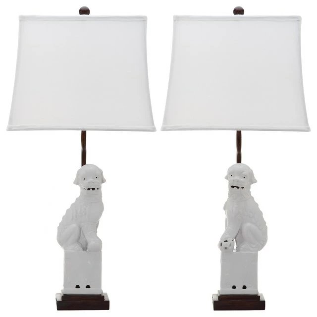 With a nod to the Far East, these stately Foo Dog table lamps add a worldly touch to any room. Crafted of white ceramic with pure cotton shade and contrasting brown stand and fittings, this centuries-old design is updated with crisp neutral colors.