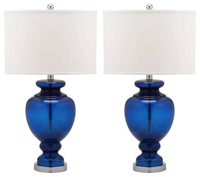 Inspired by collectible colored glass vases and bottles, the clear navy glass table lamp is a perfect accessory for coastal and cottage style interiors. Silver fittings and off-white cotton hardback drum shade update the romantic vintage look.