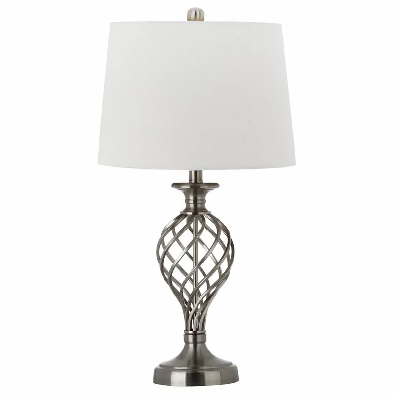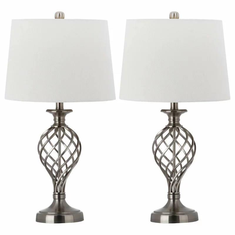 Inspired by the aristocratic charm of prewar Fifth Avenue design, this set of 2 Lattice Urn table lamps brings grand style to any room. Each posh white cotton shade sits regally atop a nickel-finished base alive with the texture of decorous curves.