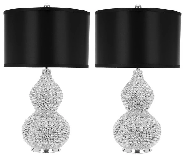 Create a unified look in a bedroom or lounge with the Safavieh Nicole Beaded Base Table Lamps. Each one has an undulating metal base, encrusted with tiny silver-plated beads. The large black drum shade and chrome finial offset the dazzling column for a refined aesthetic. Set them on either end of a sideboard, or split them across surfaces for a cohesive look across a room.