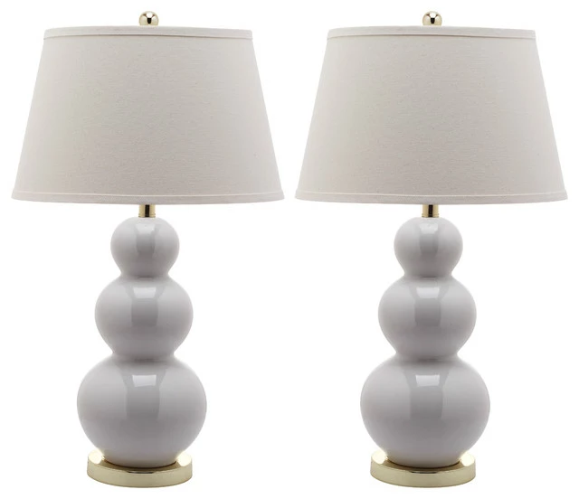 Balance fashion, form and function with the Pamela Triple Gourd table lamp, its three beautifully turned white ceramic gourds graduating in size. With brushed gold stand and fittings, and crisp white cotton tapered shade, Pamela adapts beautifully to any setting.