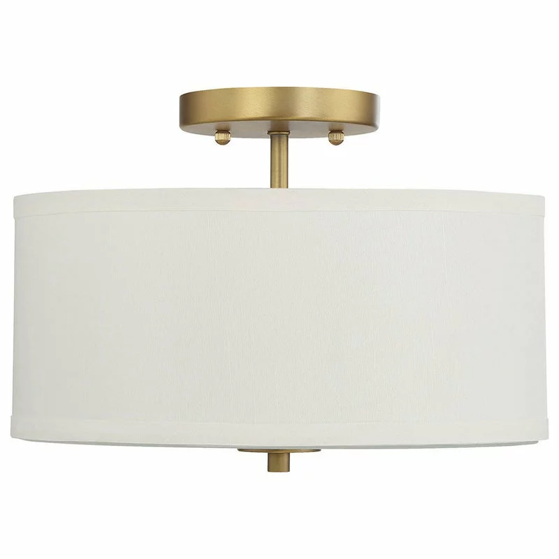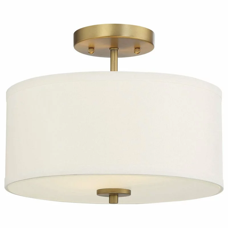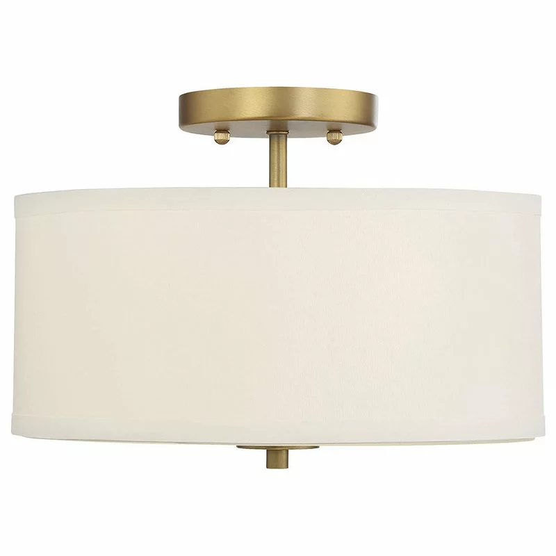 This versatile 2-light ceiling semi-flush mount has a crisp white fabric shade and Natural Brass finish.
