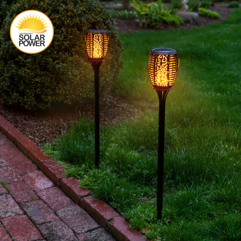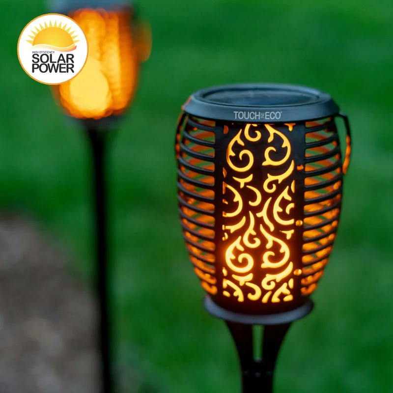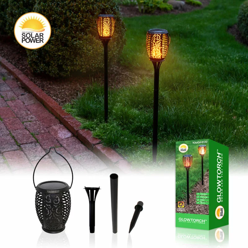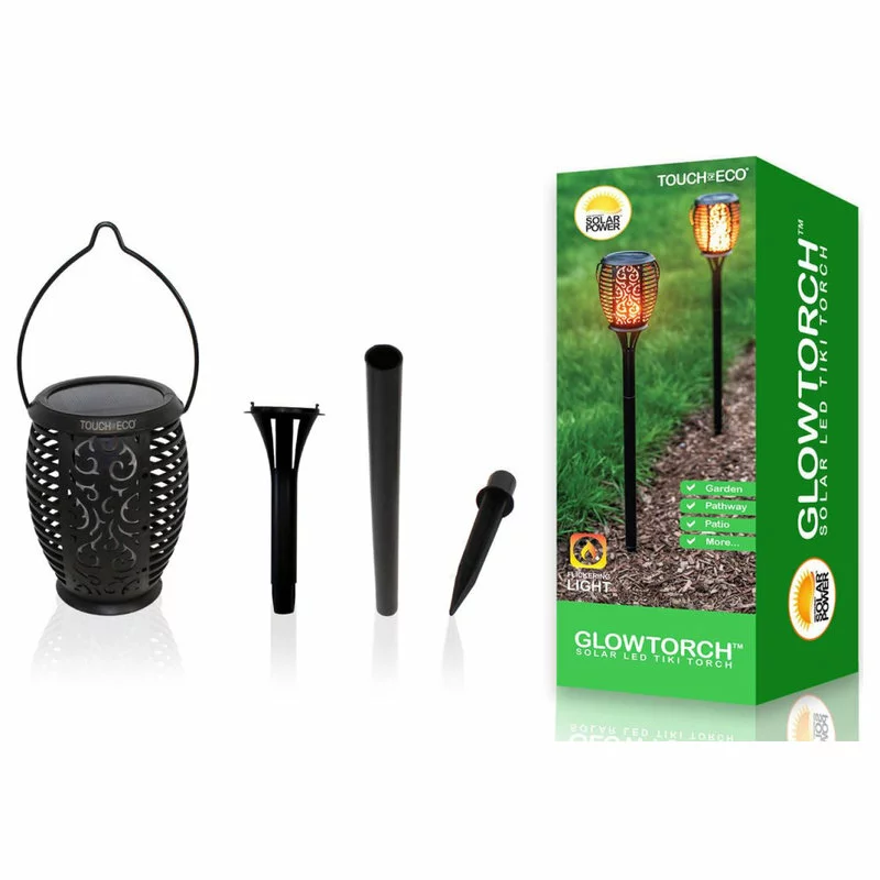 Make every night glow with Touch Of ECO’s GLOWTORCH. This solar powered 32 LED tiki torch stands 26″ tall and features ECO-SMT technology allowing each LED to flicker like a real flame. Making it the perfect balance between decoration and utility lighting. Installation takes less than a minute and the GLOWTORCH can go virtually anywhere. Whether you stake it into the ground, hang it from a fence or place it flat on a table. The GLOWTORCH (all with the click of one button) turns on automatically at dusk and off during the day to charge. Add beautiful and elegant lighting to your home garden and outdoor living area without timers, batteries or electric needed.