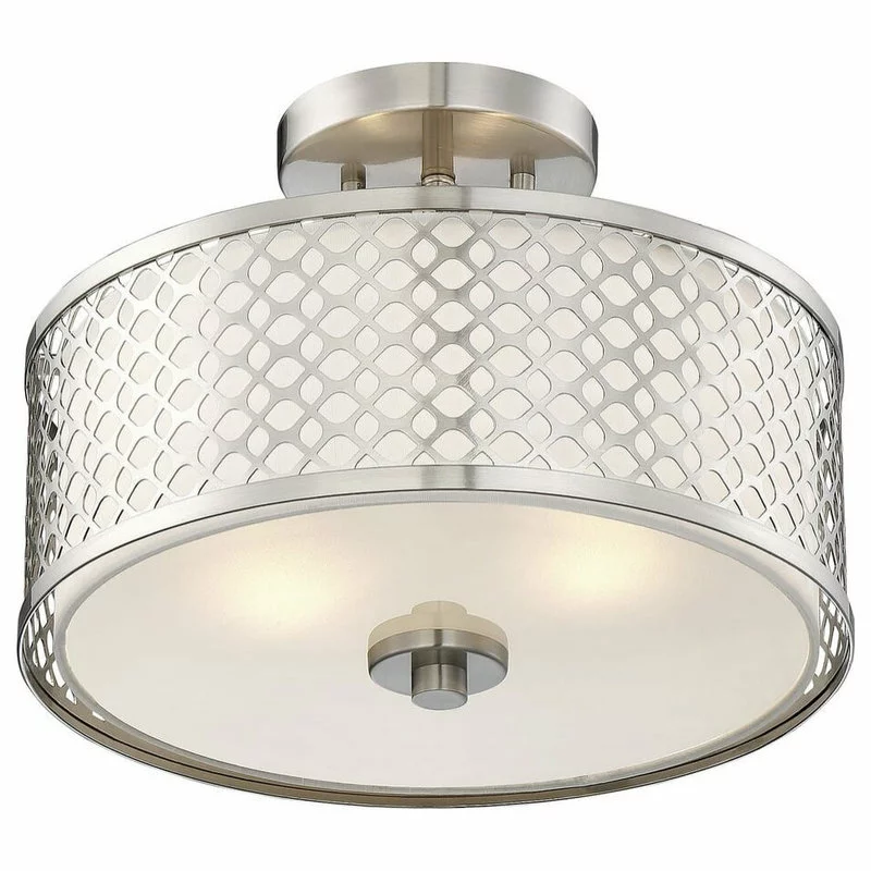 The Trade Winds Hutchins 2-light ceiling light is decorated with an intricate, interlocking pattern and paired with a white fabric drum shade to give you bright, useful light that has a touch of industrial inspired flair. A glass diffuser at the bottom of the fixture ensures you won’t get glare if you happen to look up into the fixture. Finished in brushed nickel. Hutchins is an excellent lighting idea for any space, especially smaller rooms. This fixture is dimmable and uses 2 standard size bulbs, up to 60 watts each. LED bulbs can be used. Rated for indoor use only. This light requires 2 , 60W Watt Bulbs (Not Included) UL Certified.