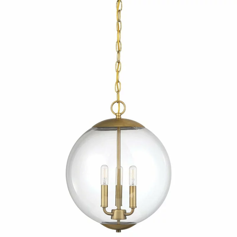 Drawing style inspiration from the past, the Katie 3-light pendant offers up a look that is perfectly suited for today’s interiors! An orb of clear glass is paired with a natural brass finish. Pendant light measures 12″ wide by 15″ high. Uses three candelabra light bulbs up to 60 watts each (not included). Long Edison bulbs recommended.Includes 10′ of chain to adjust height. This light requires 3 , 60 Watt Bulbs (Not Included) UL Certified.