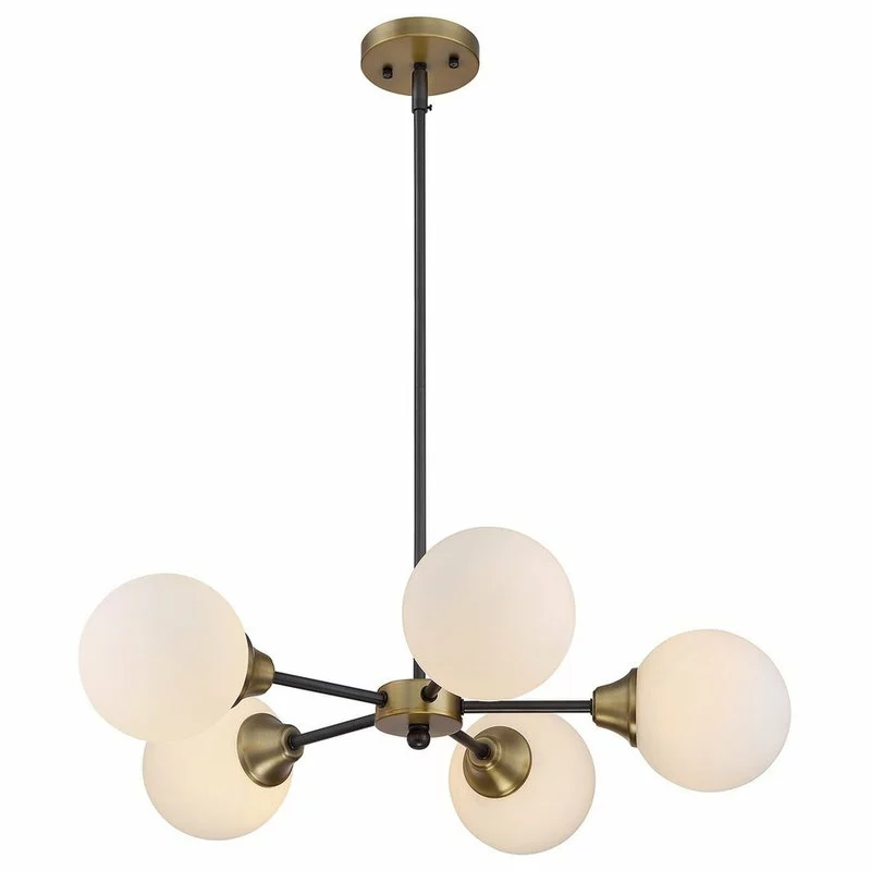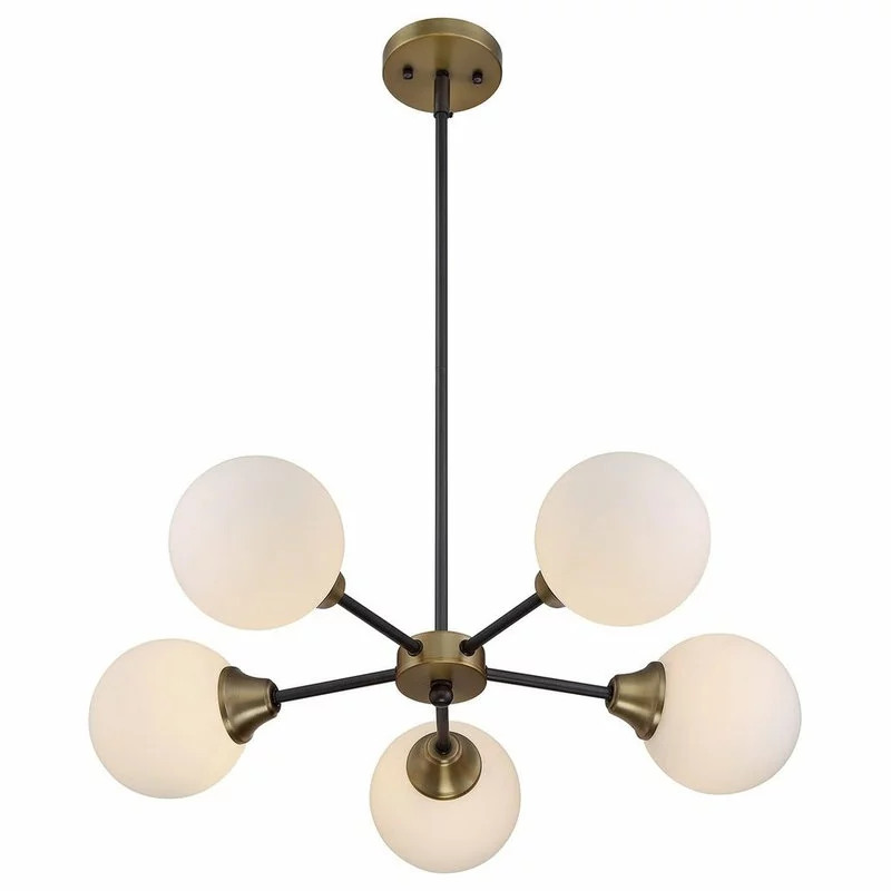 Find eye-catching midcentury modern style with the Trade Winds Marcia five-light chandelier, featuring a throwback design updated for today’s interiors. With a stylish two-tone blend of brass and oiled rubbed bronze finishes, this chandelier’s “wow” feature is its cluster of lights. Five orbs of white opal glass are splayed out in a simplified version of a sputnik light to cast subdued light in various directions. In a high-ceilinged entryway, above a dining table or used with a cluster of lights over a kitchen island, this chandelier delivers vintage style that fits with modern and transitional interiors. It can also be hung on an angled ceiling. This fixture is dimmable and uses 5 candelabra size bulbs of up to 60 watts each. LED bulbs can be used. Rated for indoor use only. This light requires 5 , 60 Watt Bulbs (Not Included) UL Certified.