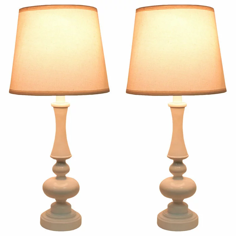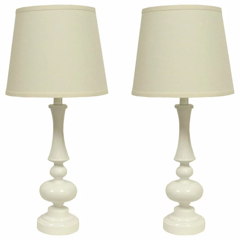 This set of two lamps includes two lamp bases in glossy white, two 7″ nickel harps, 2 glossy white finials, and two 11″ off-white linen lampshades. The lampshades have a nickel spider fitter.