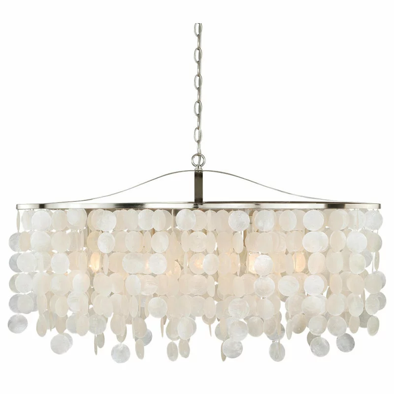 Soft contemporary styling combined with texture and iridescence. The Elsa collection 5 light oval island pendant light is a unique option to lighten and liven up the space above an elongated dining table or kitchen island. Tiers of hand-strung natural capiz shells create a soft diffused light that perfectly compliments the satin nickel metal elements. This is a full collection with coordinating pieces to decorate any room in the house.