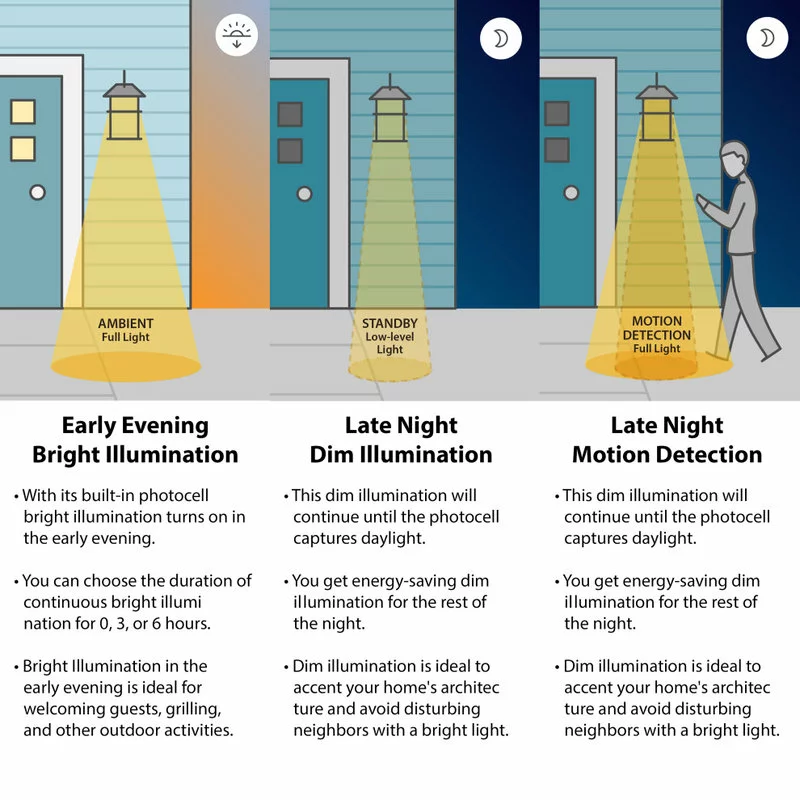 - Built in dusk to dawn photocell that automatically turns the light on at dusk and turns it off at dawn, saving energy during daylight hours