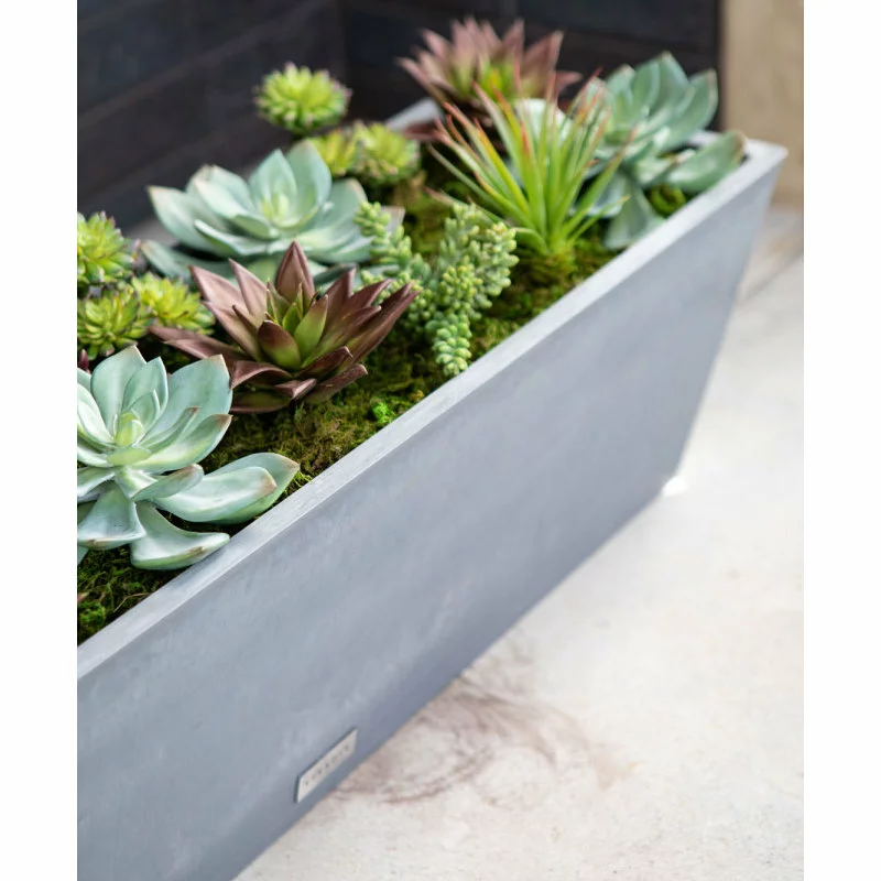 The large Beau Window Box Planter is designed to help you add flowers or an herb garden to your window sill. Its crisp charcoal gray finish is coated with UV inhibitors to minimize fading. Its single wall mold design is smooth and seamless. This sturdy and lightweight piece has a tapered rectangular shape and is built to be frost resistant.