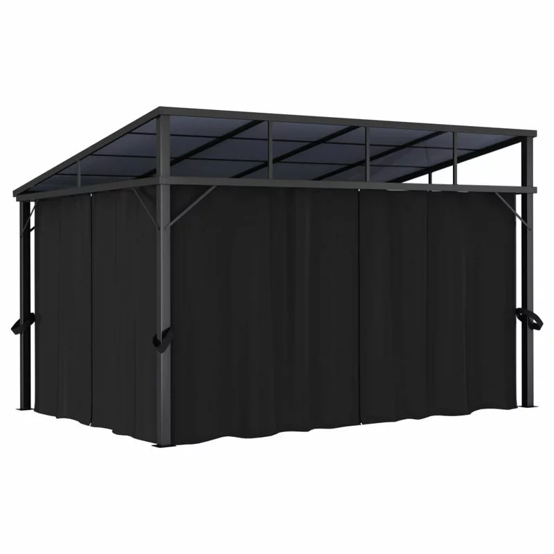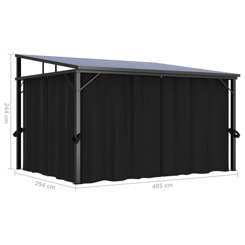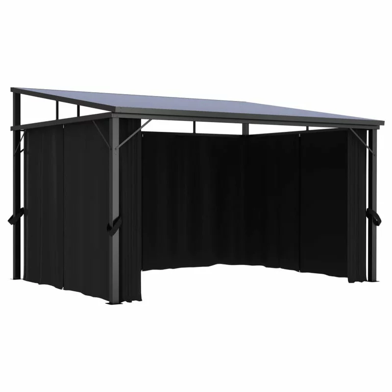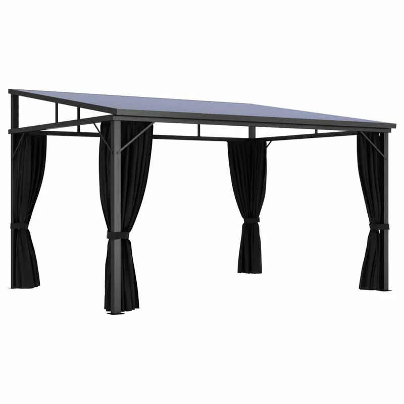 This gazebo with curtains, featuring an elegant design, provides the perfect shade and shelter from the sun for outdoor events, such as dinners, BBQs, family gatherings, and more. The roof, made of UV-resistant PVC board, guards you from the glare and harmful UV rays of direct sunlight. The gazebo is solidly constructed from strong Aluminum and steel, and it is consequently resistant to rust and very stable. Additionally, this item is easy to assemble. NOTE: This product should NEVER be used under bad weather, such as strong wind, heavy rain, snow, storm, etc.