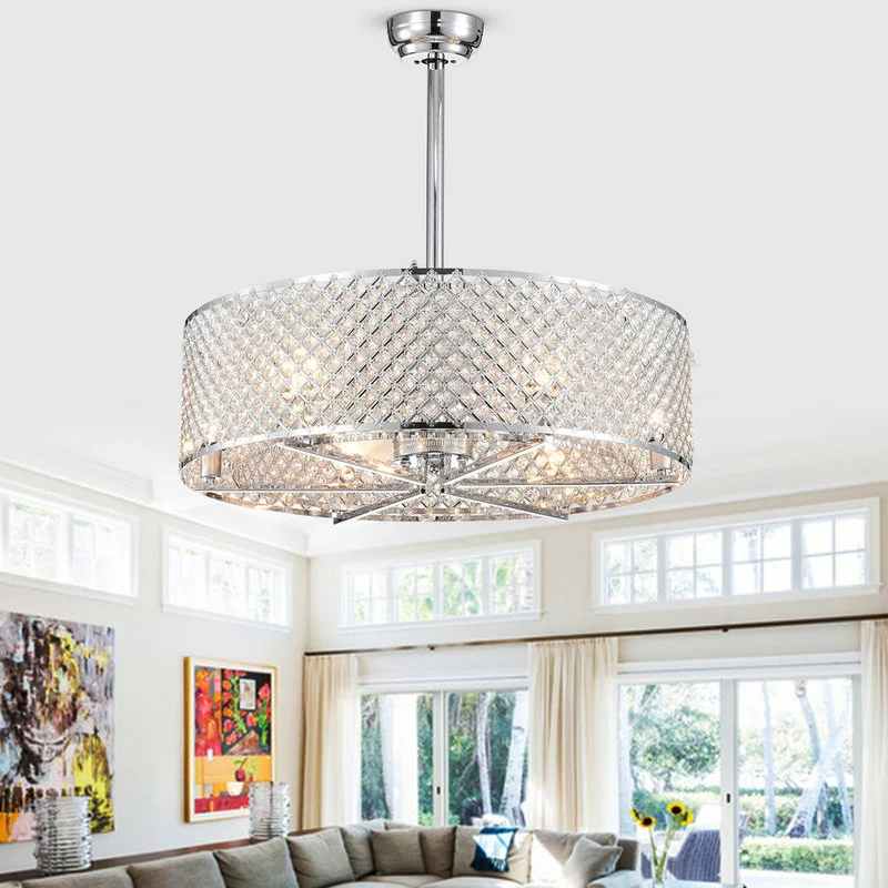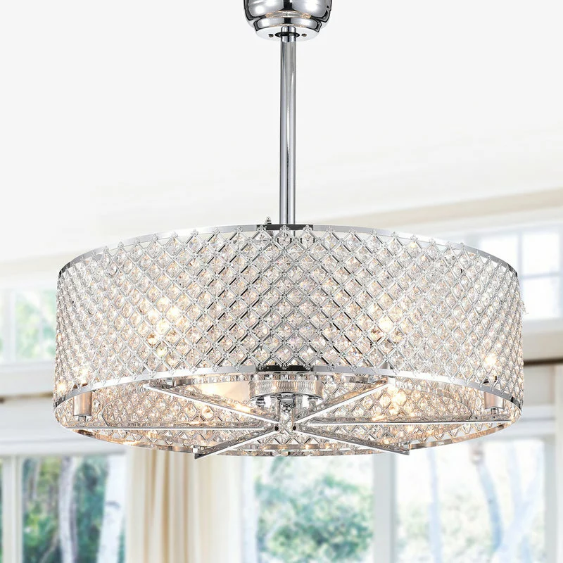 Chrome finished double-drum ceiling fan with cloaked fan blades (also known as a Fandelier – Fan d’Lier). Both Outer and inner latticed shades are embedded with brilliant diamond cut octogon crystals. 6-Lights for great illumination. Height is adjustable between two selectable downrod lengths. Scoop style fan blades move air with great efficiency. Six fan speeds insure you can choose just the right amount of breeze for your comfort. Solid metal construction and great detail work. A fantastic find.