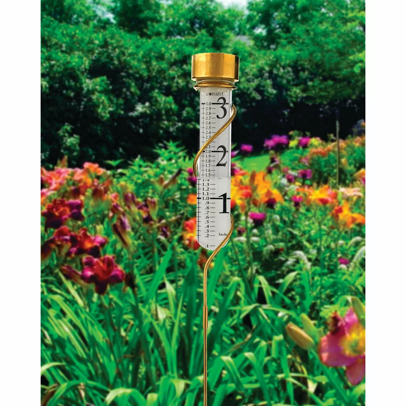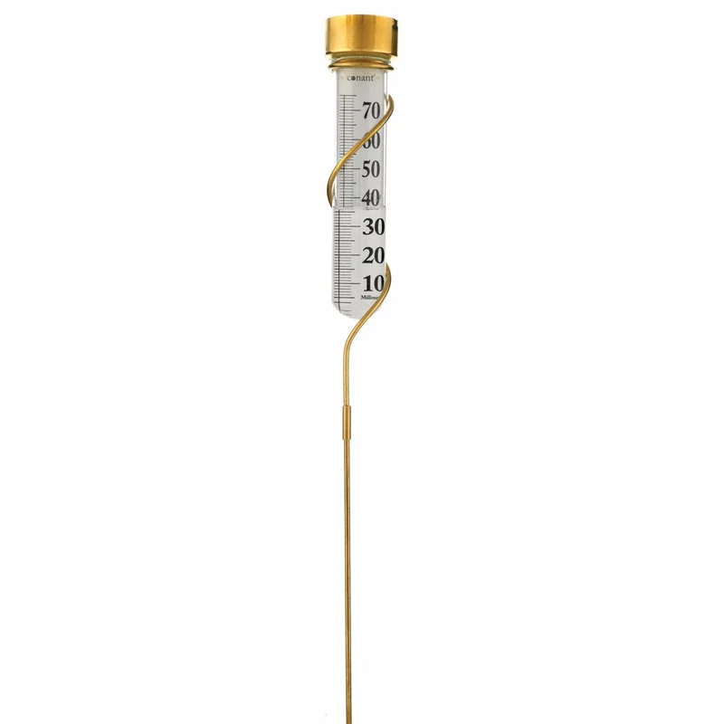 This Decorative rain gauge helps you conserve water. It not only collects and measures the amount of rain that has fallen over a given period of time, but also measures the amount of water used when watering your lawn and garden. Measuring in 1/10 inch increments on one side and 1mm increments on the reverse side the curvature of the glass vial magnifies the numerals by 50%. The twisting stake mounts in the ground and can also be post mounted. A metal screen in the collection funnel keeps out unwanted leaves and bugs.