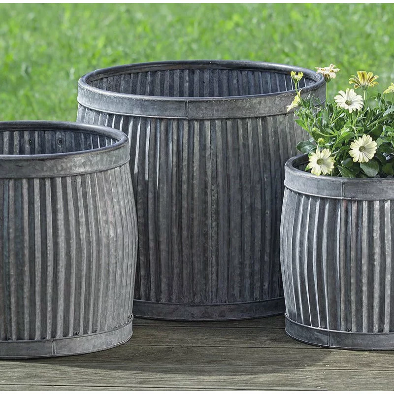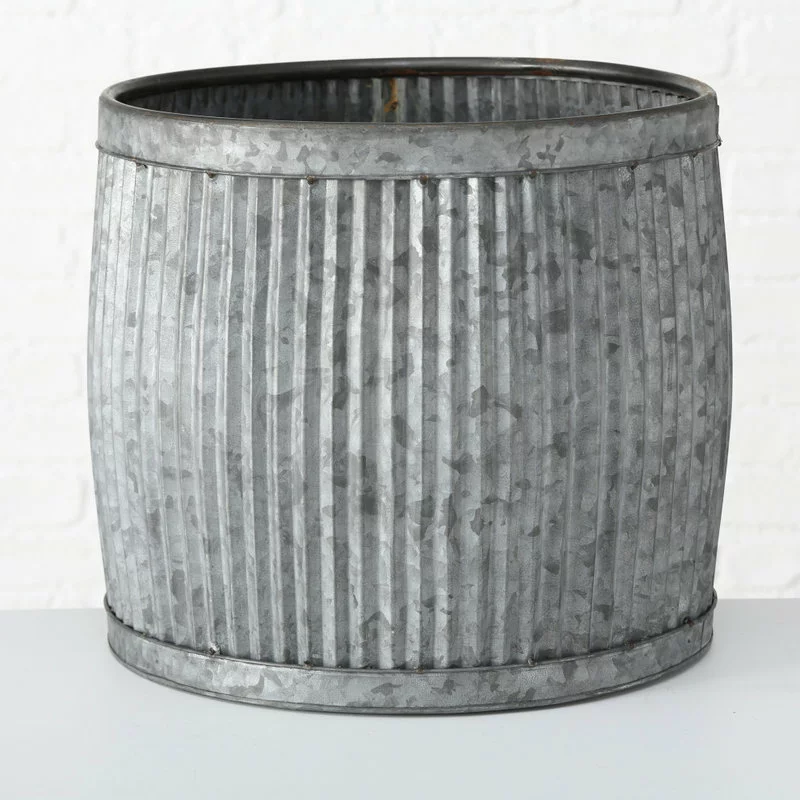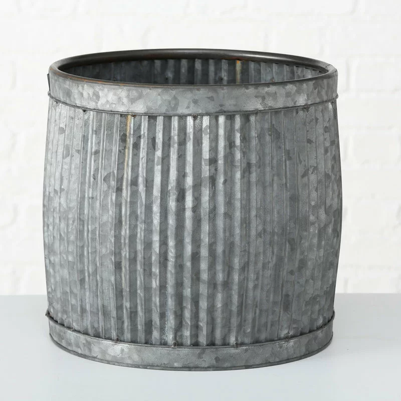 Galvanized metal planters. Expand your gardening space with these metal planters inspired by those found in French country gardens. This eye-catching set of 3 is perfect for growing pots of herbs, vegetables, and container plants. Loaded with rustic charm, these metal planters are detailed with vertical corrugated ribs, bands at top and bottom, and rolled rims. Beautifully proportioned, display them next to each other to create a leveled container garden or individually to suit your spaces. These over-sized planters range in size from over 1 Ft in diameter and measure as follows: 1- large 17 D x 15 H, 2 – medium 14 3/4 D x 13 3/4 H, and 3- small 12 D x 12 H inches. Delightful for lots of uses beyond holding plants, these basins score extra points for being a great multi-taskers. They are perfect as catch-all in the house to organize and keep things all together in one place, to being outdoors to hold icy cold drinks during warm weather entertaining. When not in use, nest them inside each other for space efficient storage.