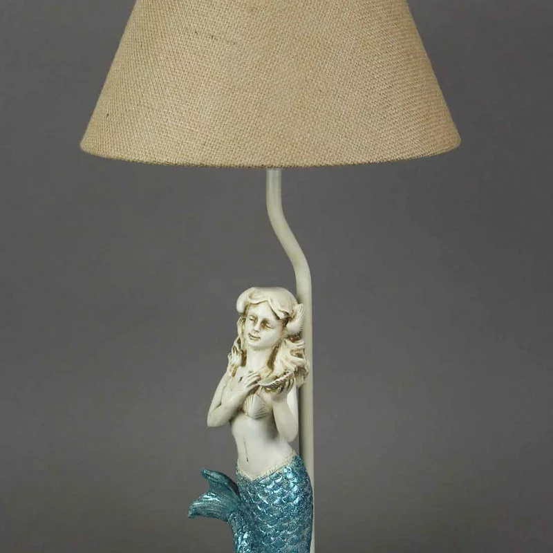 Bring a splash of ocean magic to your home with these blue-tailed mermaid table lamps. Creatively cast in resin for a detailed and durable decorative base depicting a peaceful mermaid holding a pearl-adorned oyster, each piece is given a smooth finish and a blue glitter-covered tail. A subtle burlap shade keeps the spotlight on the magical mermaid messengers and is sure to gently accent your decor, from the saltiest sea dog’s nautical-themed living room to the bedroom of someone who dreams of being a mermaid. Great for end tables, nightstands, and desks in living rooms, dens, bedrooms, or hallways. These lamps each measure 22.5 inches high when assembled, and have 11-inch diameter burlap shades, and 5-inch diameter bases. Each lamp uses 1 Type A 60 Watt Max bulb (not included) and sports a 62-inch power cord.